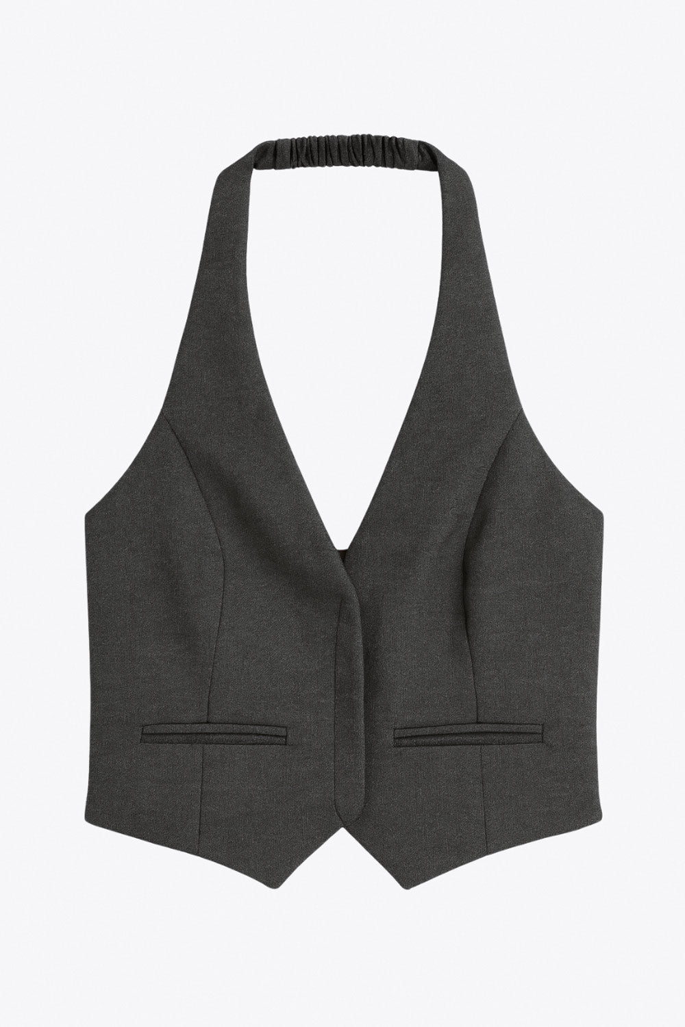 Chaleco corto cuello halter, fit ajustado, escote v, cierre frontal con hilera oculta de botones, vivos decorativos frontales y bajo v frontal. Escote en espalda y detalle de trabilla ajustable posterior.