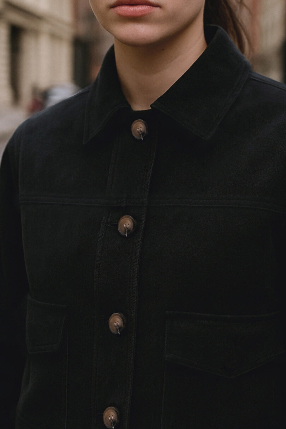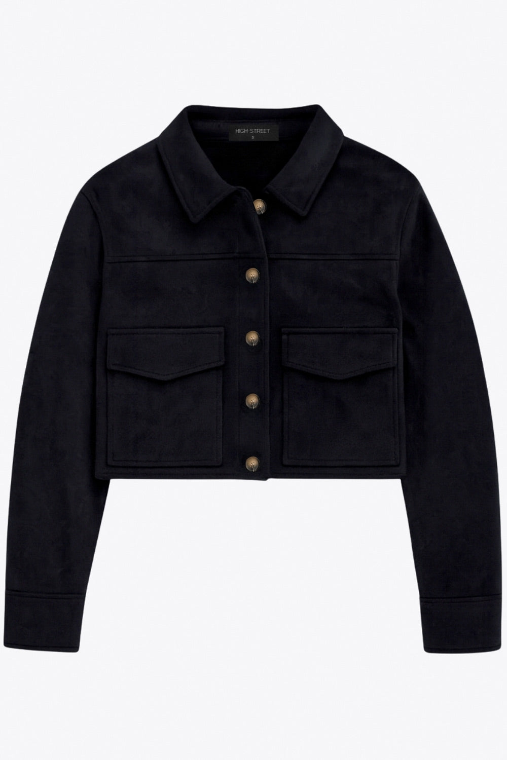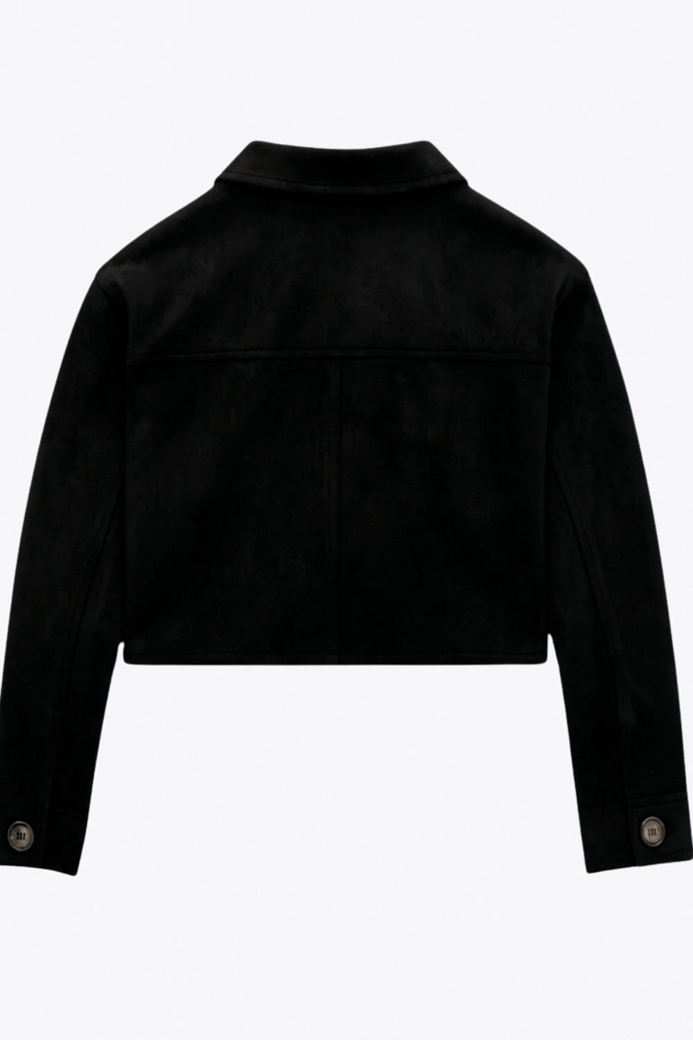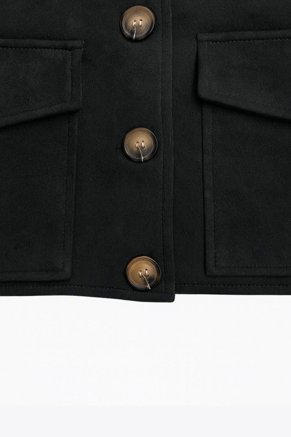 Chamarra corta fluida de gamuza, manga larga con puño abotonado, cuello camisero, bolsillos frontales de parche y cierre frontal con hilera de botones en contraste.
