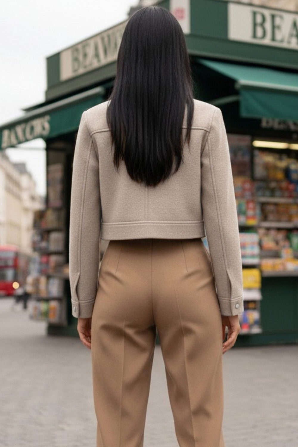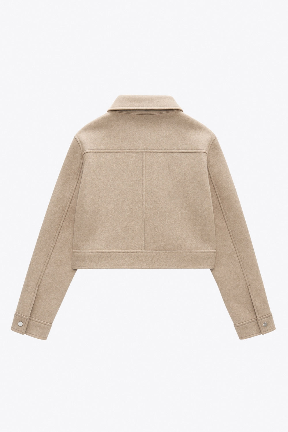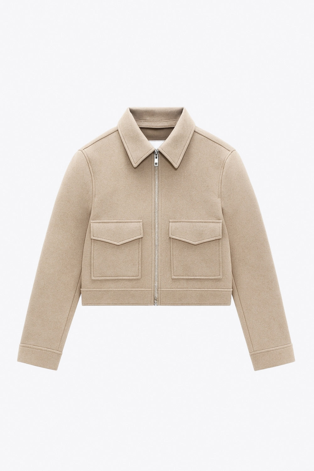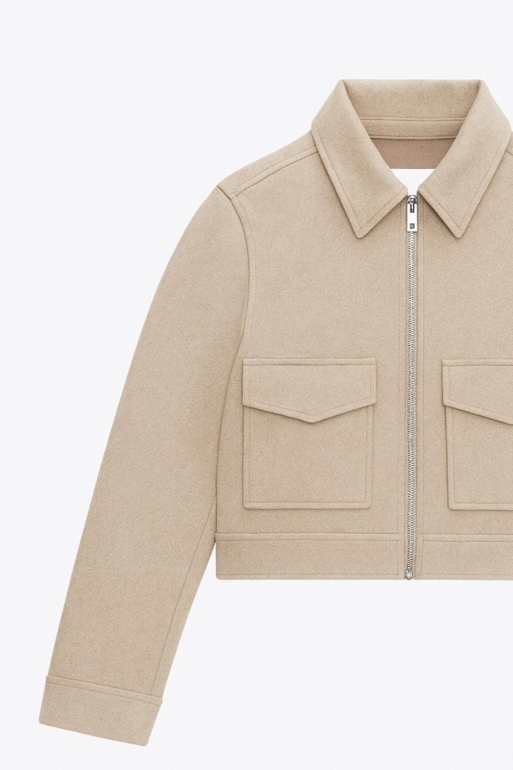 Chamarra corta de fit recto, manga larga con puño abotonado, cuello camisero, bolsillos delanteros de parche con cartera y cierre frontal con cremallera visible en contraste.