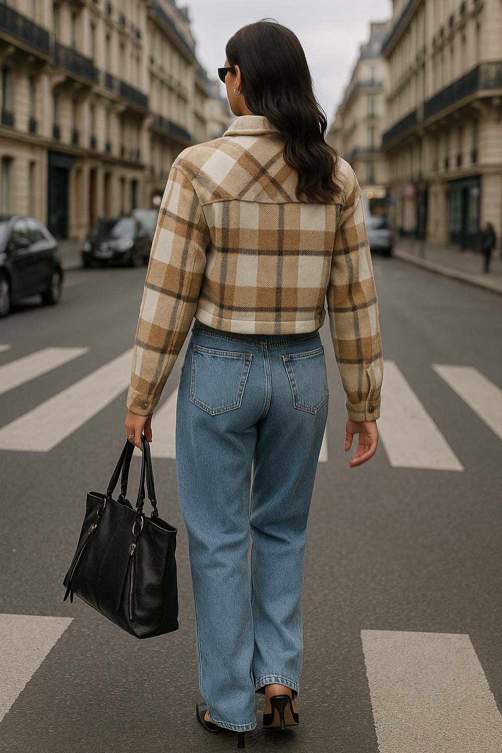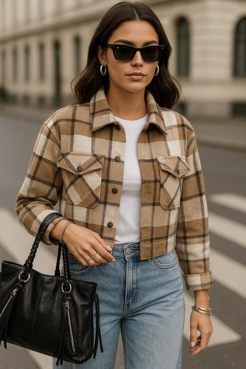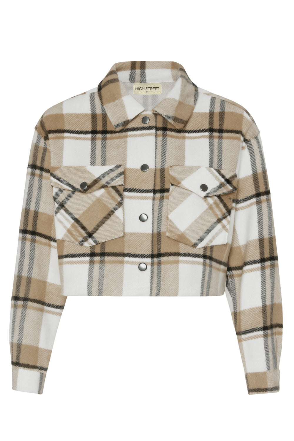 Chamarra corta de estampado check, fit recto, manga larga con puño abotonado, cuello camisero, bolsillos delanteros de parche con cartera y botón de presión. Cierre frontal con hilera de botones en contraste.