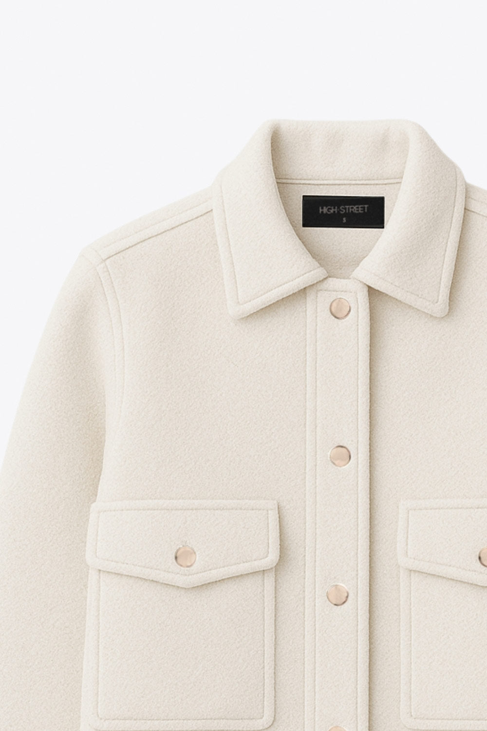 Chamarra corta de fit recto, cuello camisero, manga larga con puño abotonado, bolsillos delanteros con cartera y botón. Cierre frontal con hilera de botones en contraste.