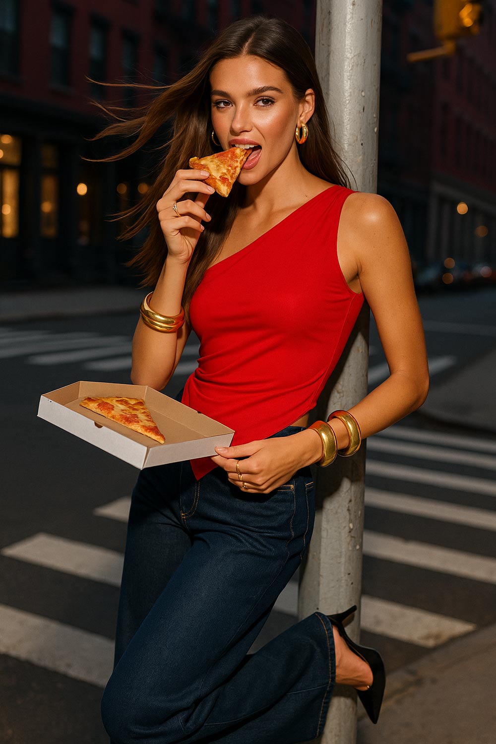Top ajustado sin mangas, de cuello diagonal con hombro descubierto, plisados en hombros y bajo frontal asimétrico.