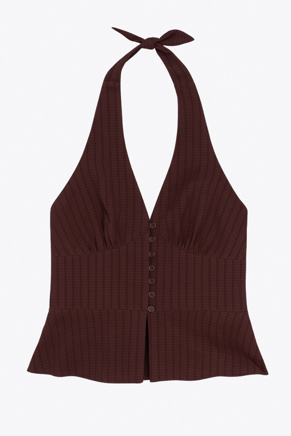 Top corto de cuello halter con nudo amarrable posterior, escote v con cortes y plisados decorativos frontales, fit ajustado, escote en espalda con fruncido posterior, cierre frontal con hilera de botones y abertura en bajo.