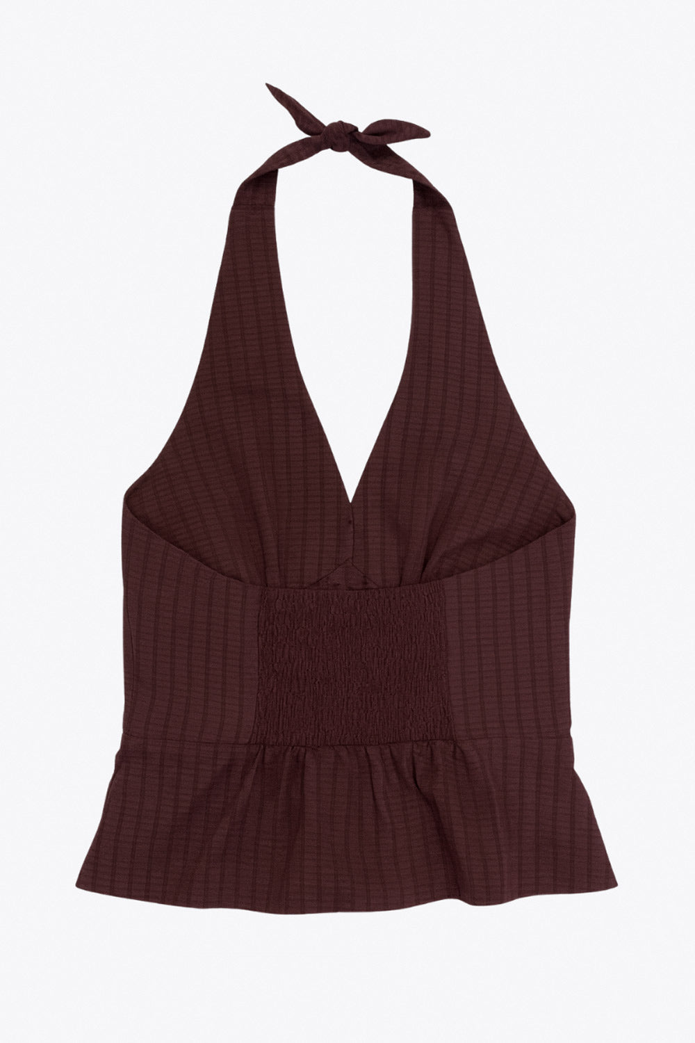 Top corto de estampado rayas, cuello halter con nudo amarrable posterior, escote v con cortes y plisados decorativos frontales, fit ajustado, escote en espalda con fruncido posterior, cierre frontal con hilera de botones y abertura en bajo.