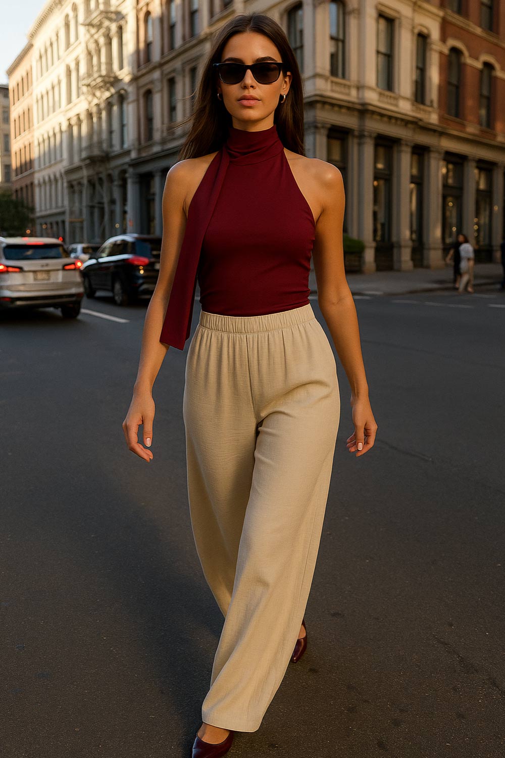 Top de fit ajustado, sin mangas, escote en espalda, cuello halter con plisados y nudo amarrable.