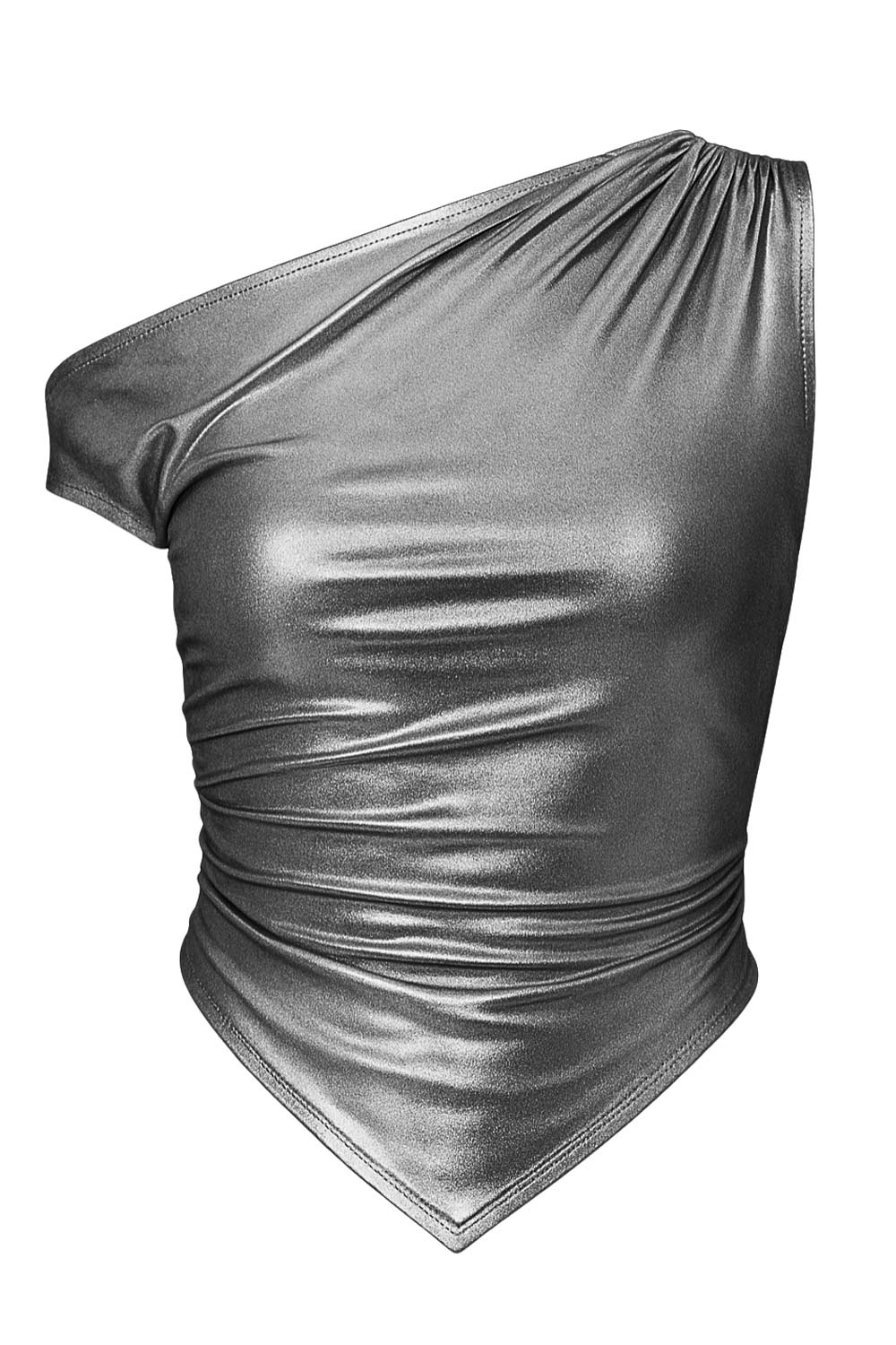 Top metálico asimétrico de fit ajustado, escote diagonal, una manga corta seguida con hombro descubierto, plisados en hombro y bajo frontal asimétrico. Detalle de plisados en costados.