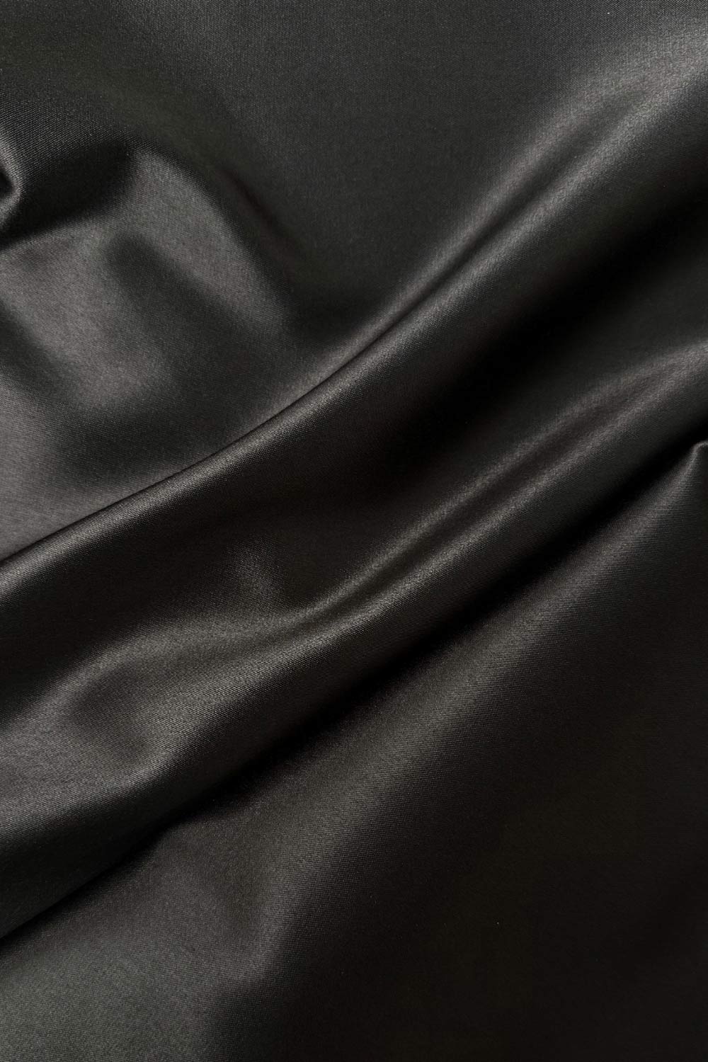 Maxi vestido satinado de fit recto, cuello halter cruzado con lazo amarrable posterior, escote en espalda y cierre posterior con cremallera oculta. Detalle de abertura lateral en bajo.