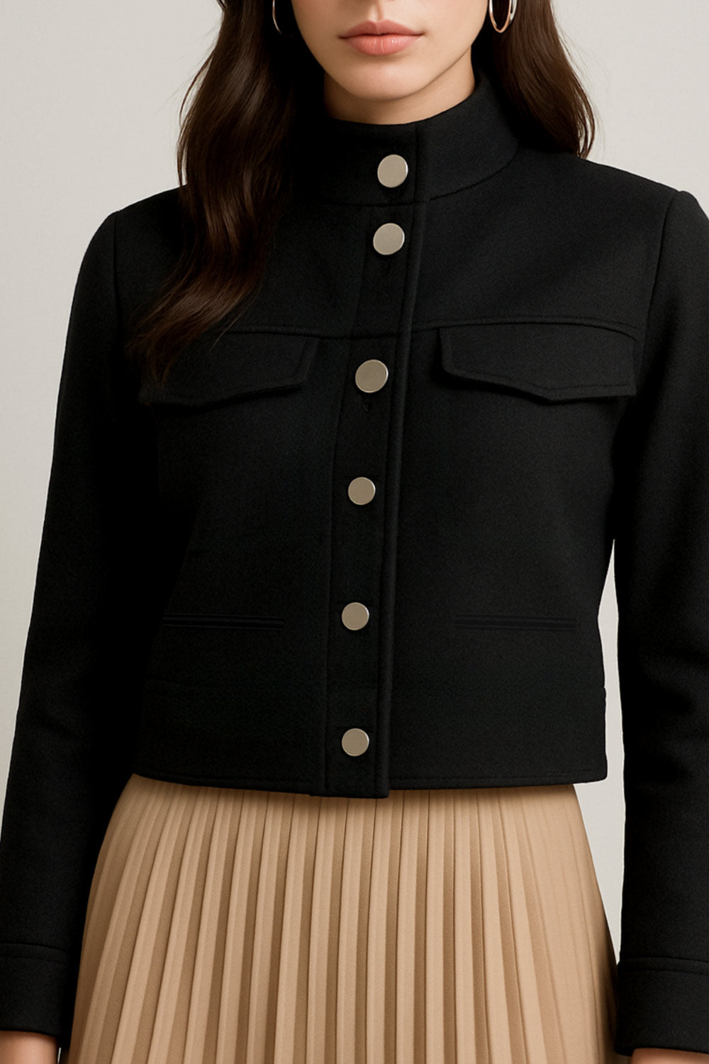 Chamarra de fit recto, manga larga con puño, cuello mock, bolsillos decorativos con cartera y vivos frontales. Cierre frontal con hilera de botones en contraste.