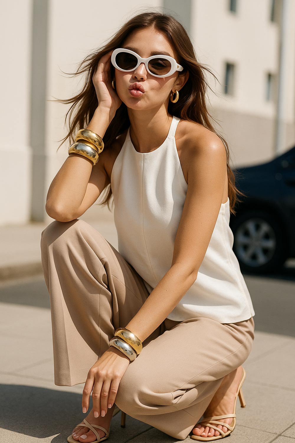 Blusa de fit fluido, cuello halter con nudo amarrable posterior, escote en espalda y cierre posterior con trabilla ajustable.