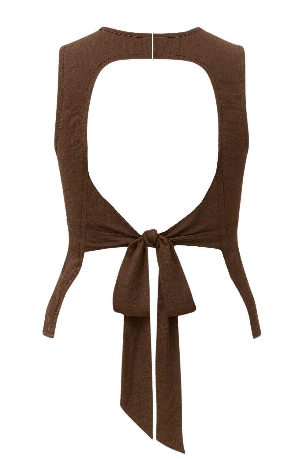 Blusa corta de fit ajustado, cuello redondo, sin mangas, pinzas frontales y cut out en espalda con lazo amarrable posterior. Cierre con botón y ojal posterior.