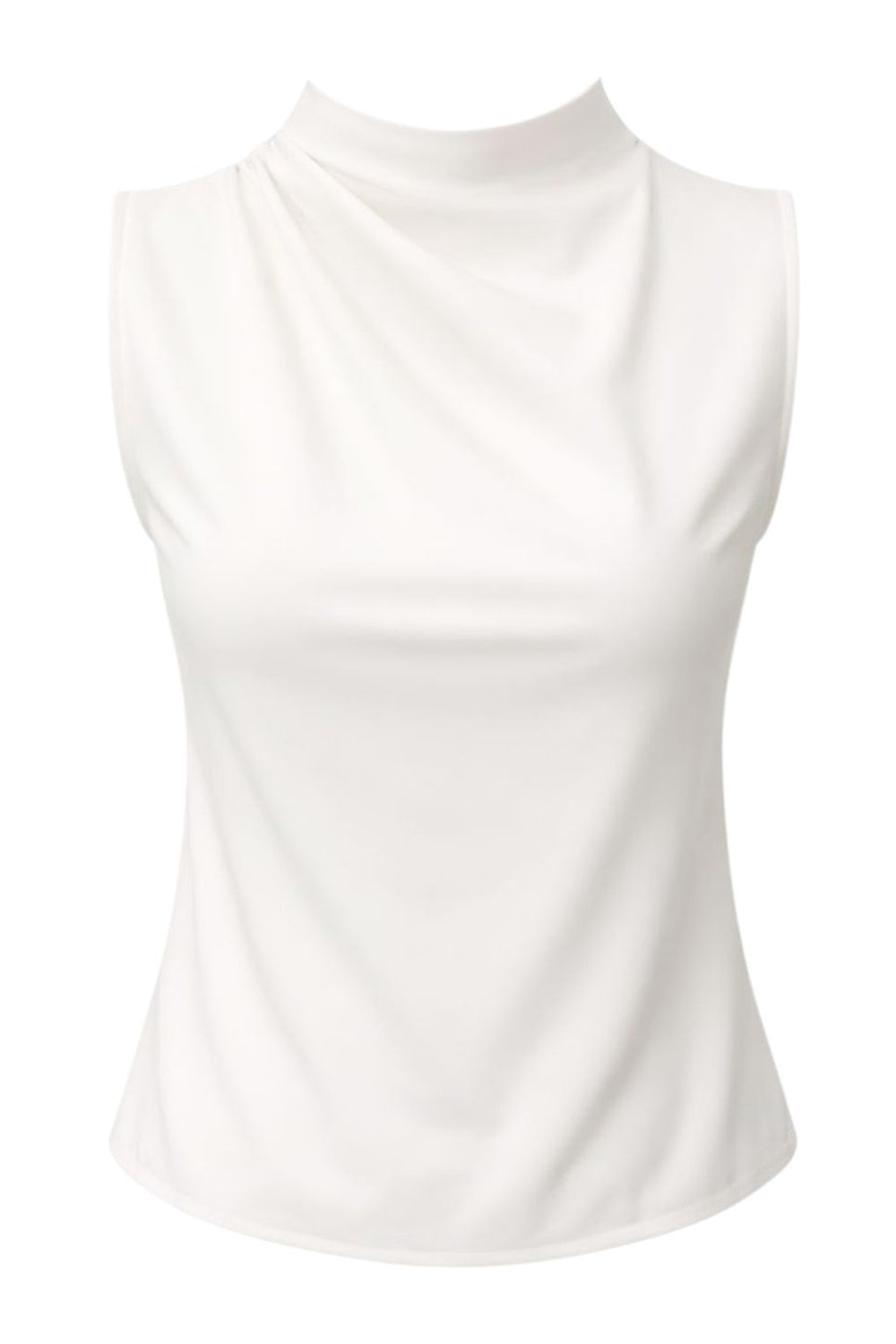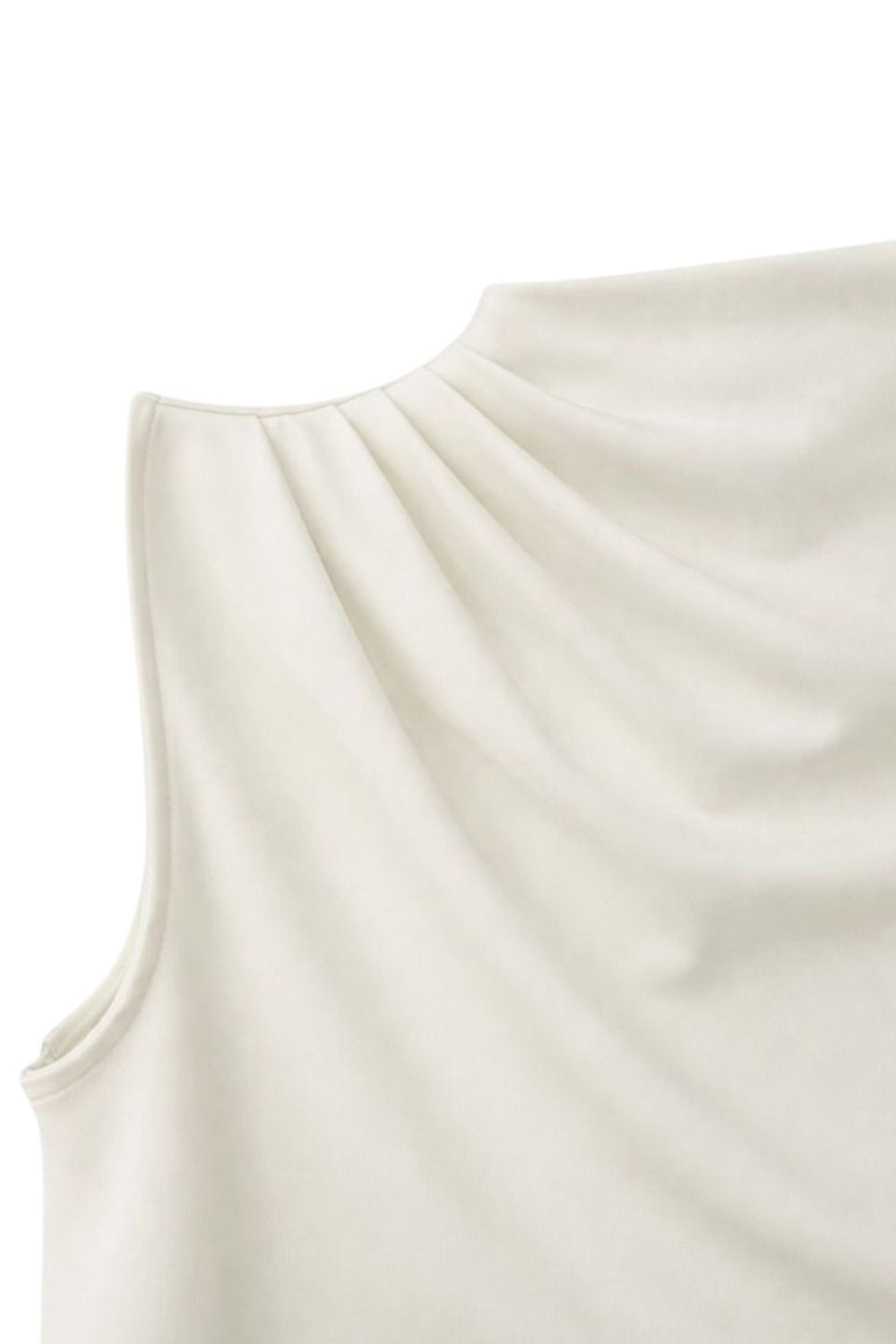 Blusa de fit recto, sin mangas y cuello alto con detalles plisados en hombros. Cierre posterior botón y ojal.