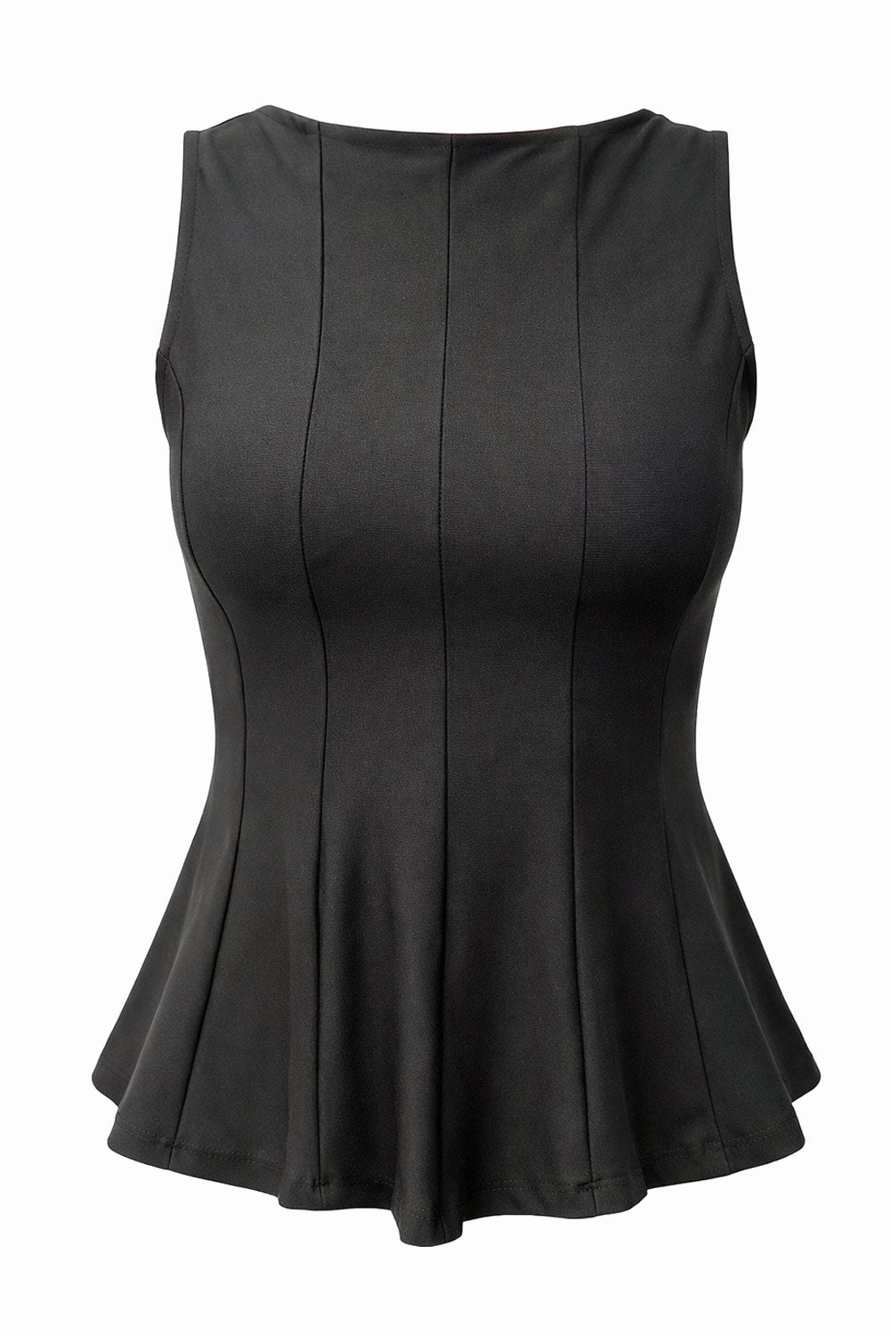 Blusa de fit ajustado, sin mangas, cuello barco, cortes frontales y peplum con olanes en bajo.