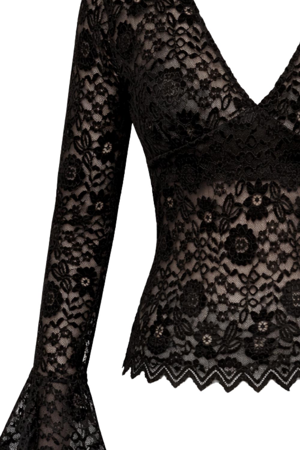 Blusa de encaje, fit recto, manga larga con olanes en puños, escote v con cortes frontales y detalle decorativo en bordes.