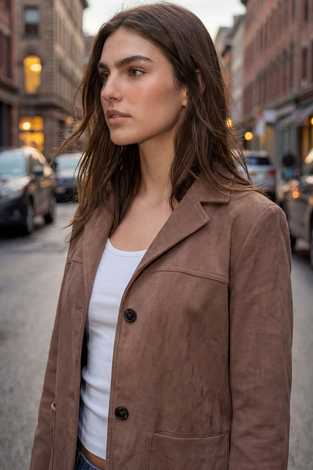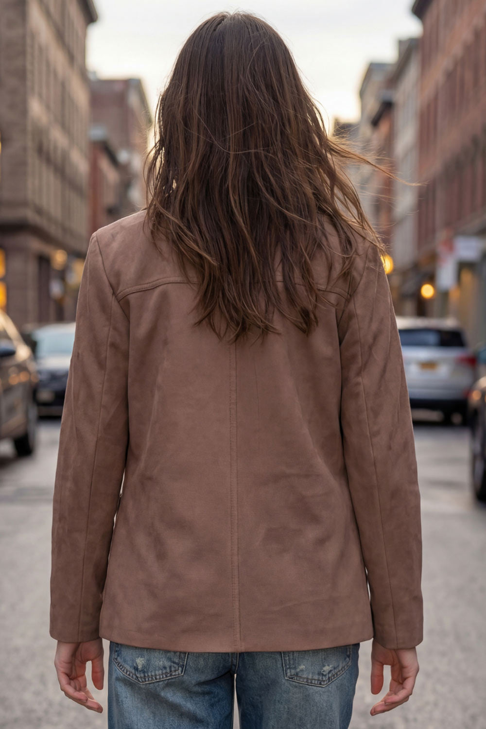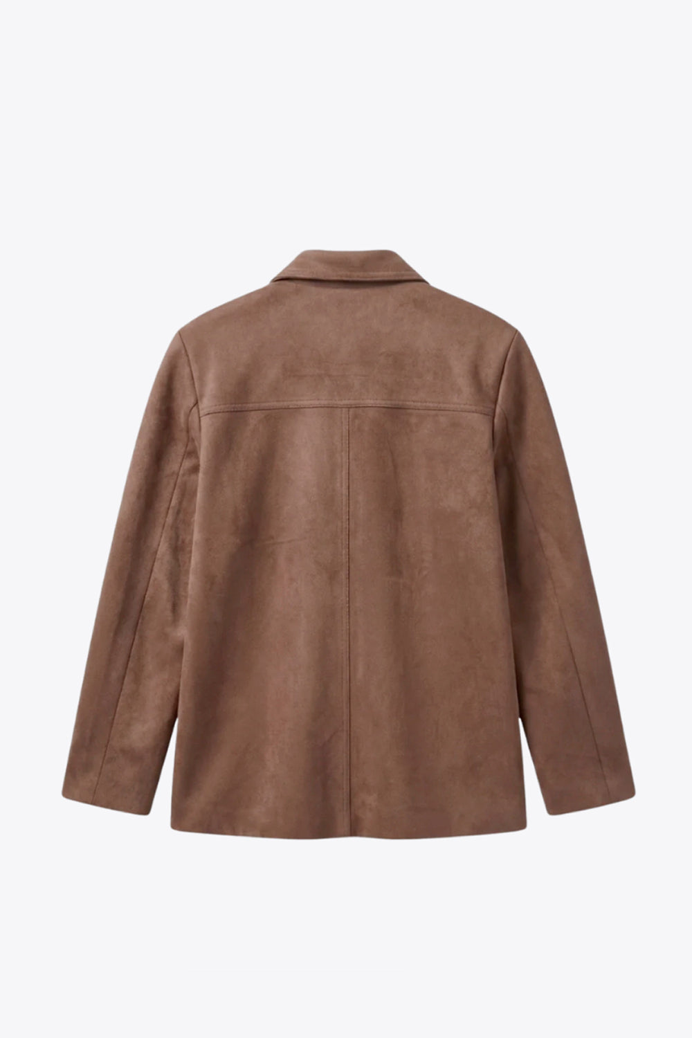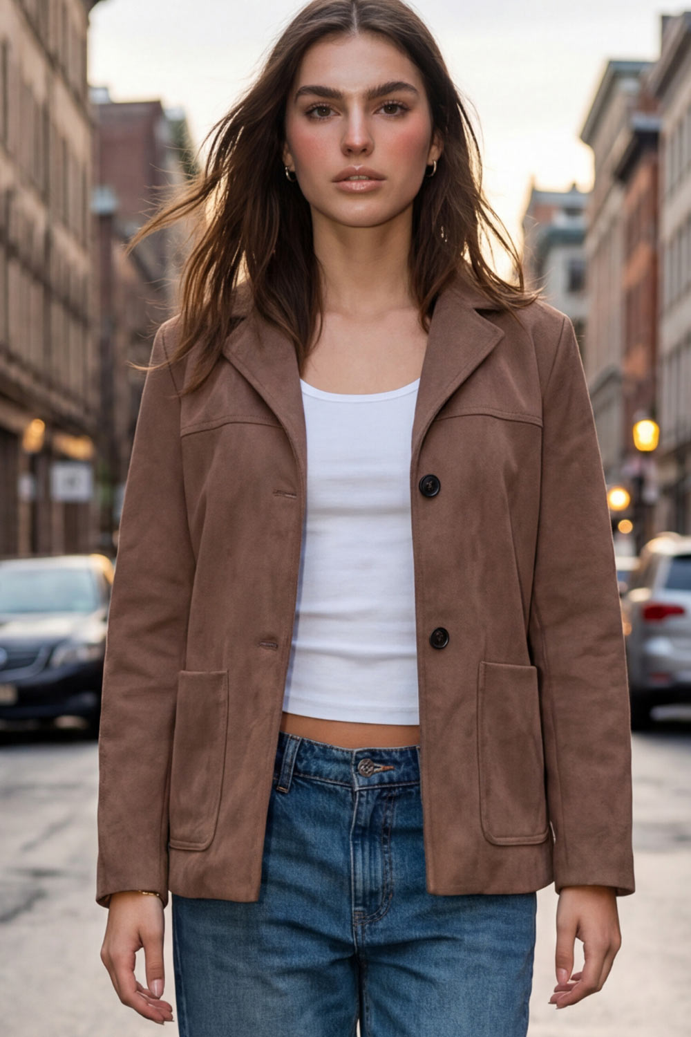 Blazer de gamuza, fit recto, con solapa, manga larga y bolsillos delanteros de parche.