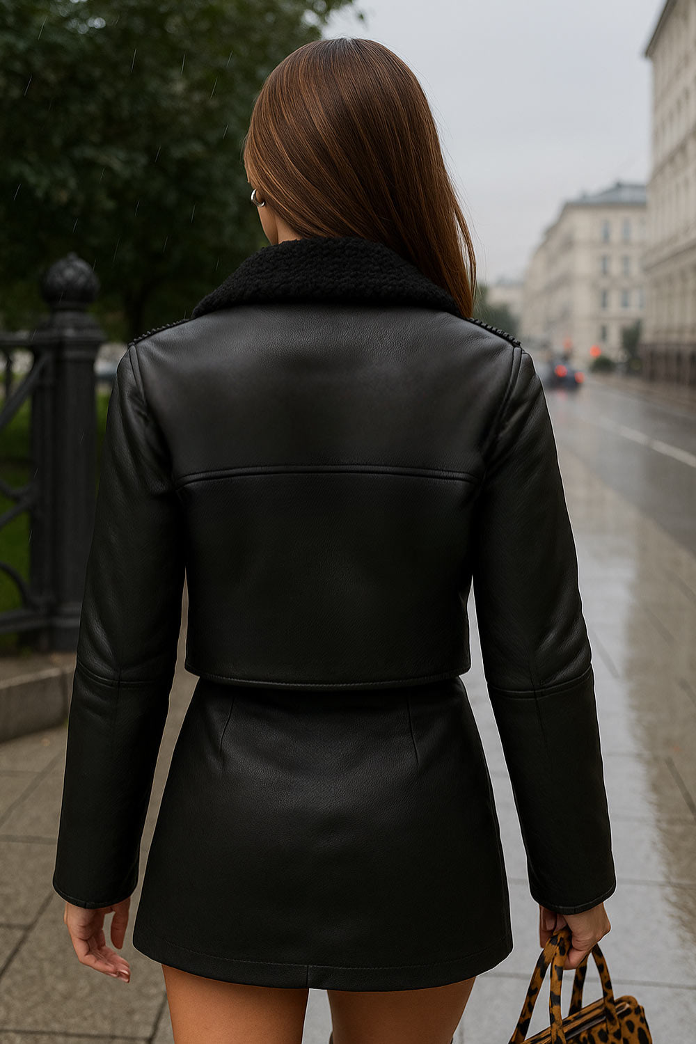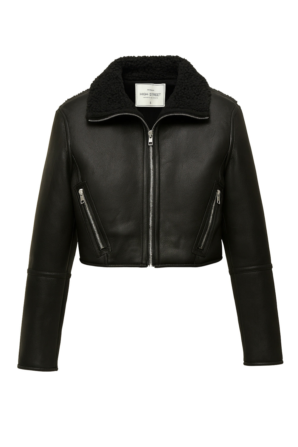 Chamarra corta de efecto piel, interior de borreguillo, cuello solapa, bolsillos delanteros con cremalleras, fit recto, manga larga con costuras decorativas y cierre frontal con cremallera en contraste.