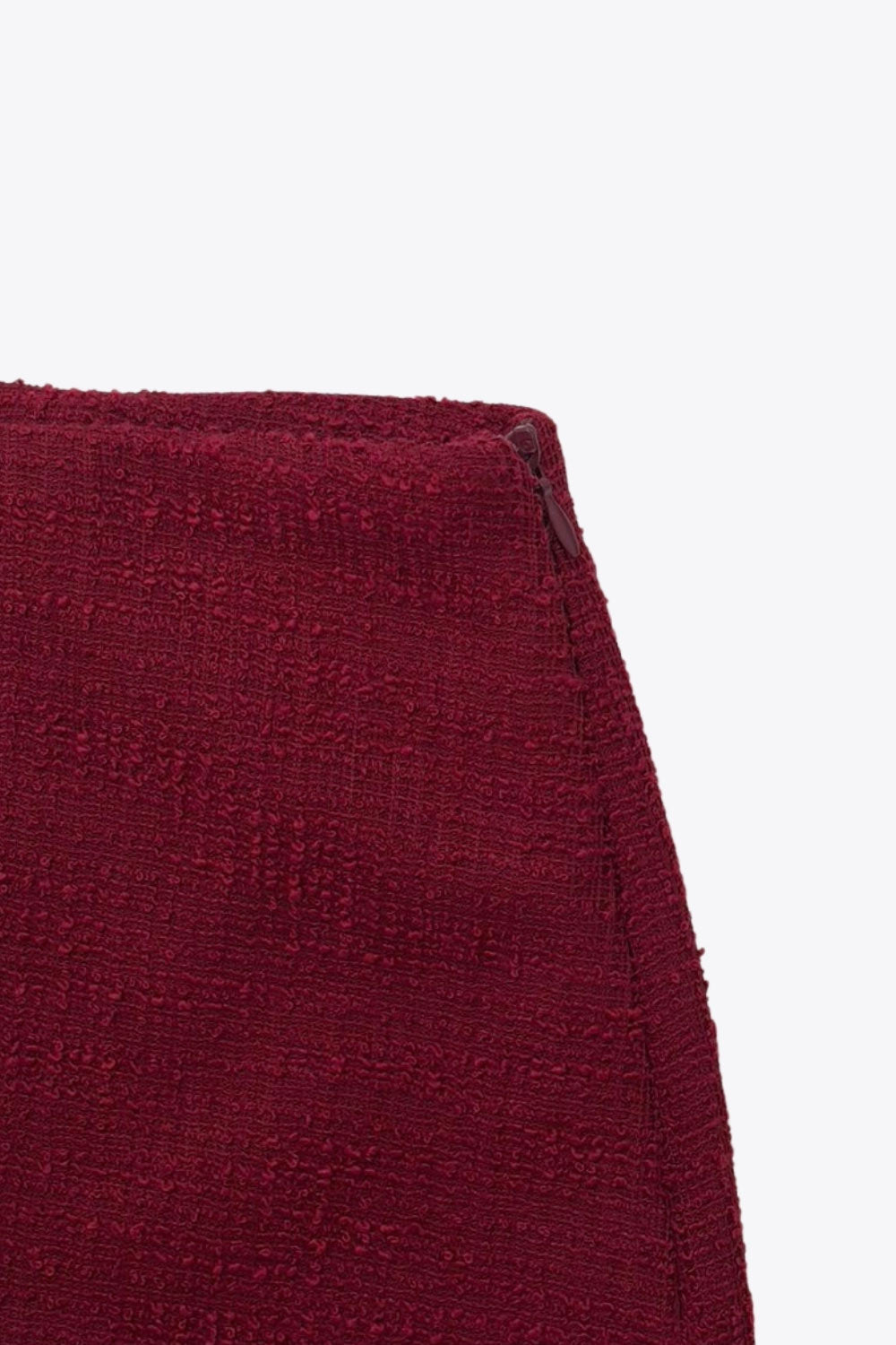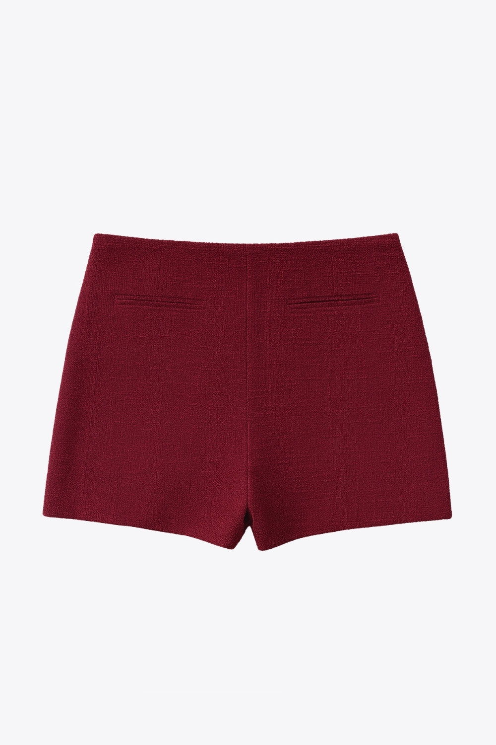 Falda short corto de bouclé, fit ajustado, cintura alta, vivos decorativos posteriores y cierre lateral con cremallera oculta.