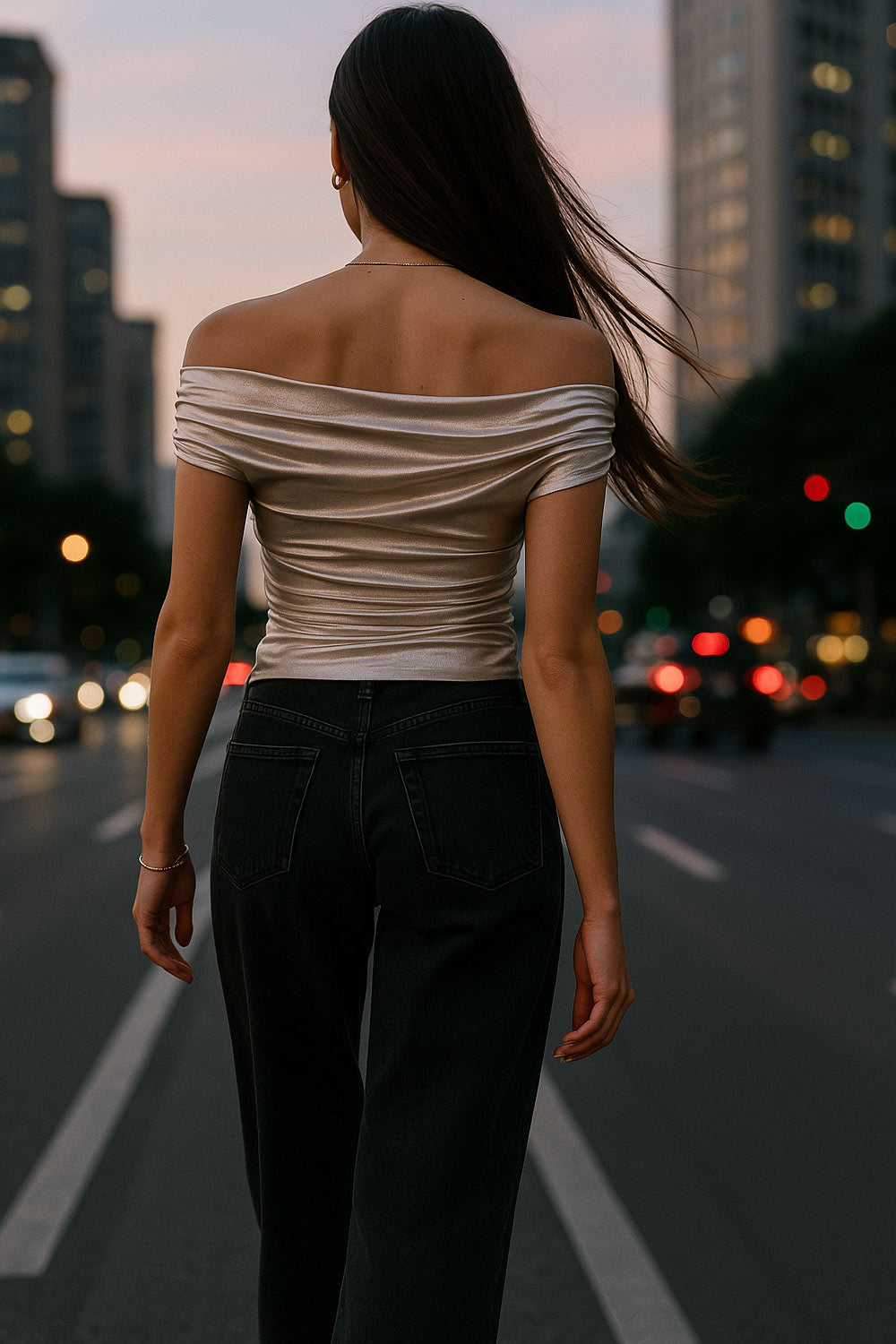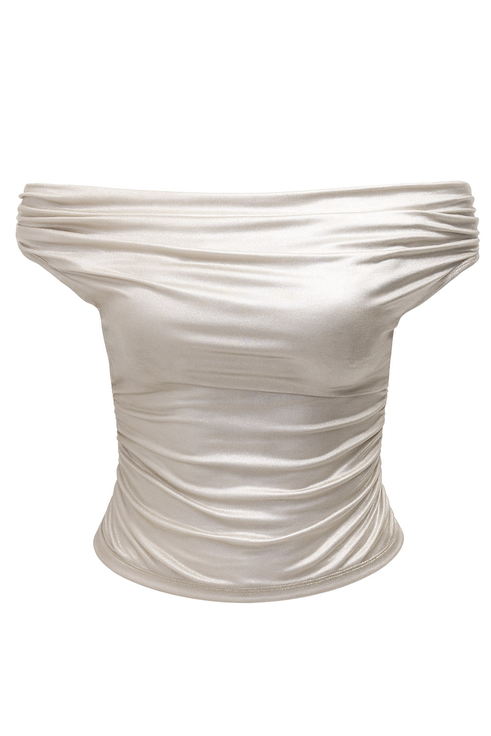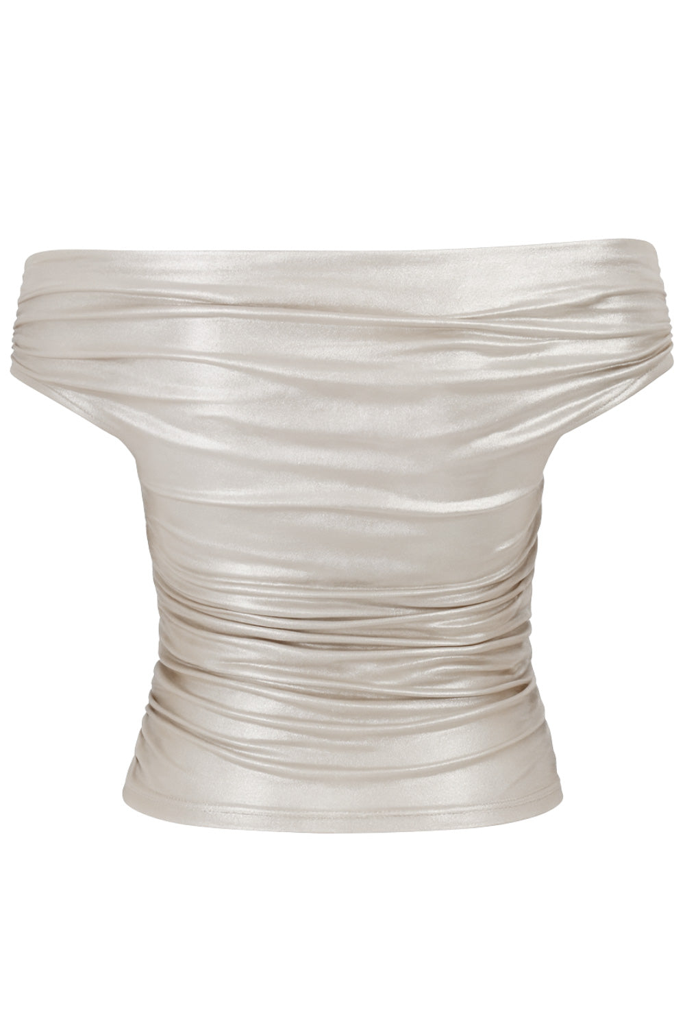 Top metálico de fit ajustado, hombros descubiertos, escote recto y manga corta seguida con plisados laterales.