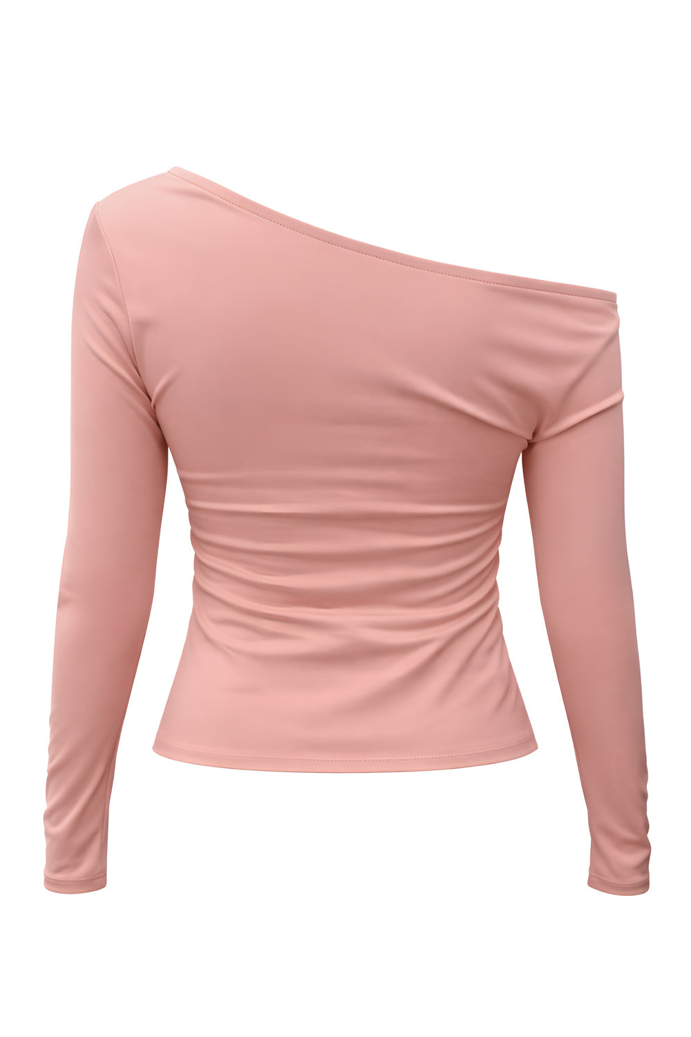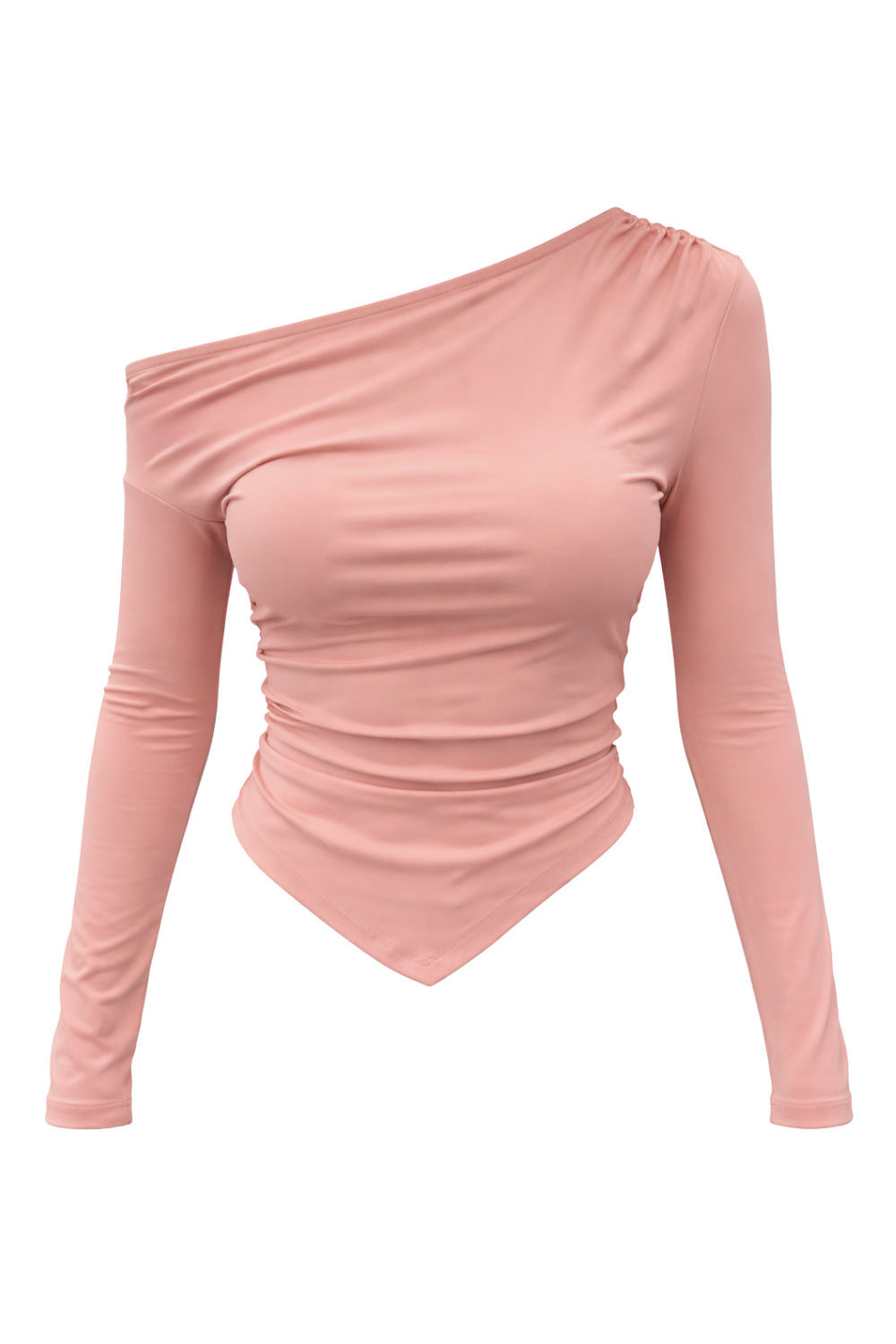 Top asimétrico de fit ajustado, cuello diagonal asimétrico con hombro descubierto, manga larga, plisados en un hombro y bajo v frontal.
