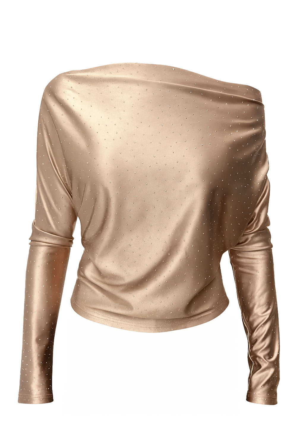 Top satinado de cuello diagonal asimétrico con hombro descubierto y manga larga seguida. Detalle de aplicaciones de brillos.
