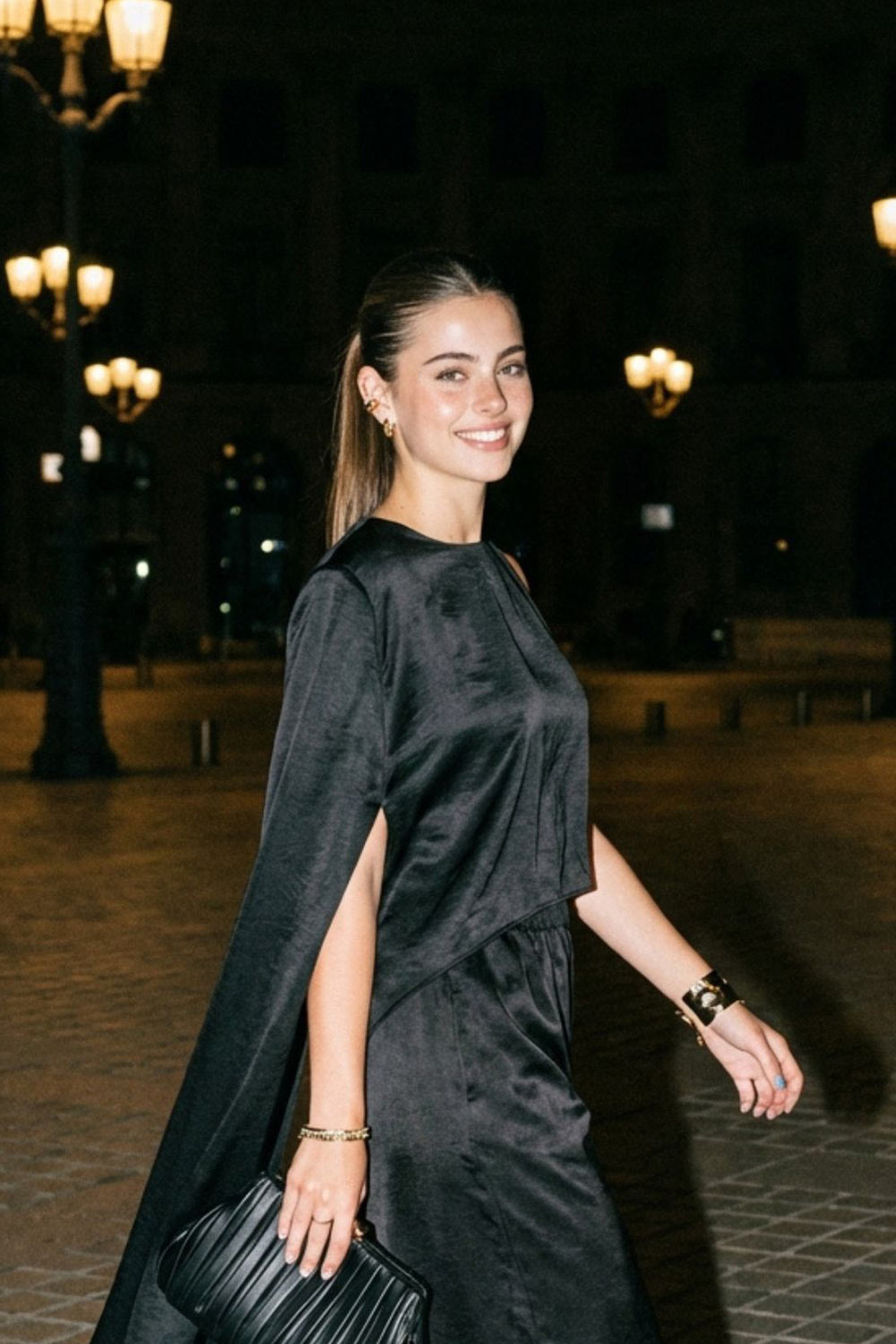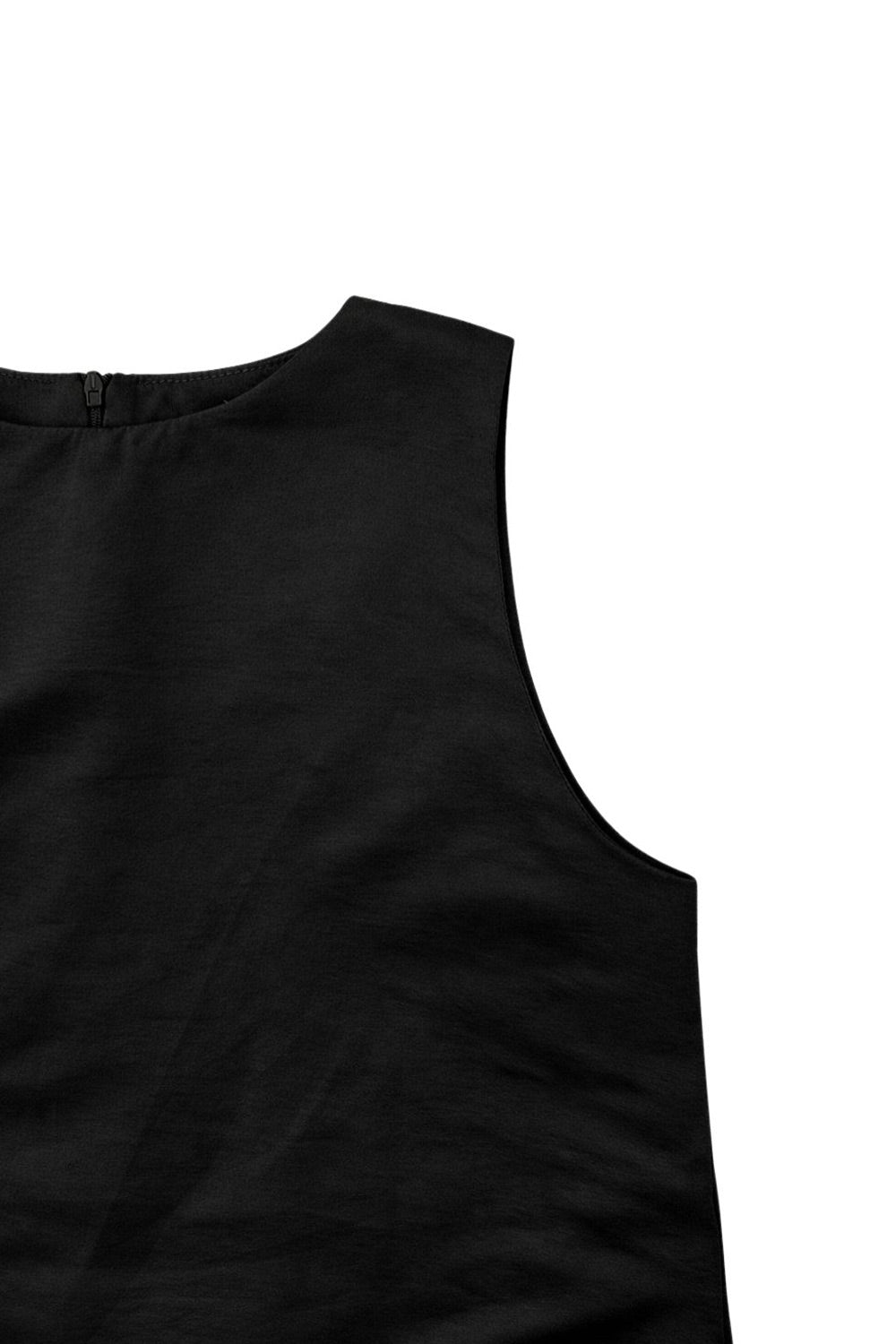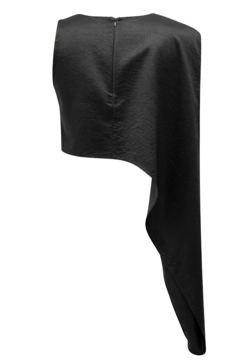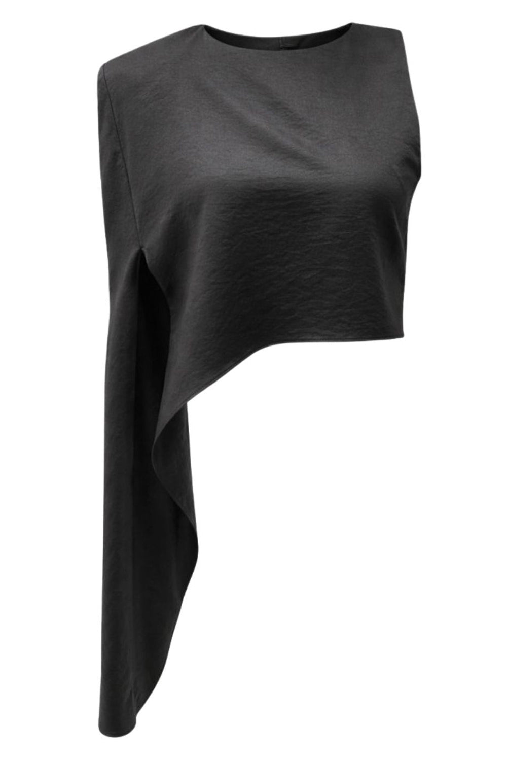 Blusa tipo túnica asimétrica, de cuello redondo, con hombreras, una manga corta seguida, fit fluido y bajo asimétrico.