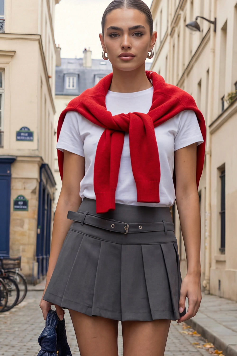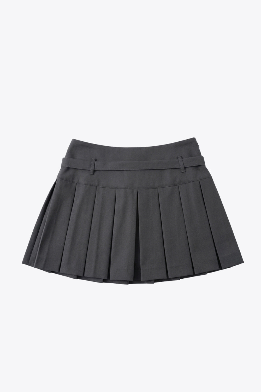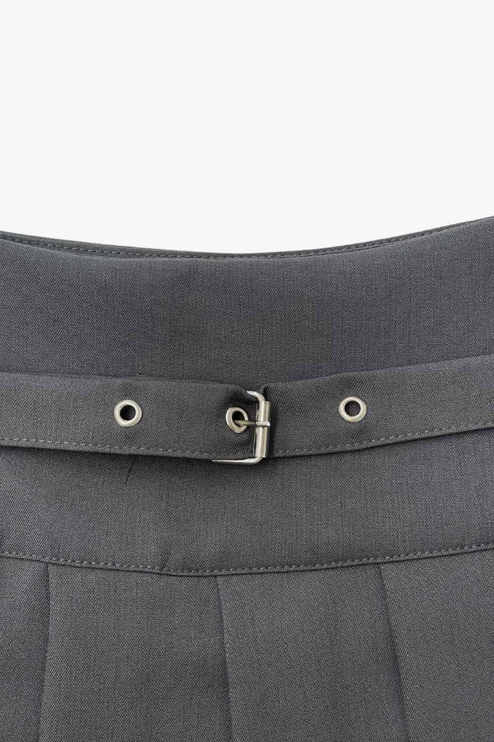 Falda short corto tableado, de cintura alta con pretina ancha, trabillas y cinturón del mismo tejido con hebilla en contraste. Cierre lateral con cremallera oculta.