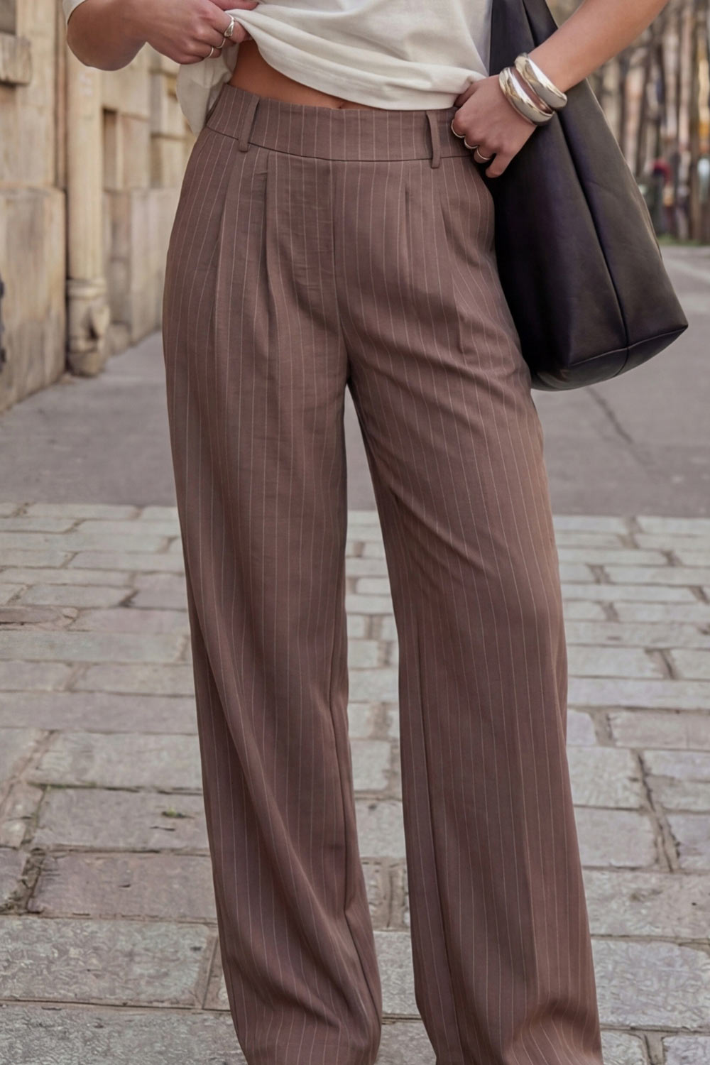 Pantalón fluido de fit wide leg, estampado rayas, cintura alta con pretina elástica posterior, trabillas, pinzas frontales y bolsillos delanteros.