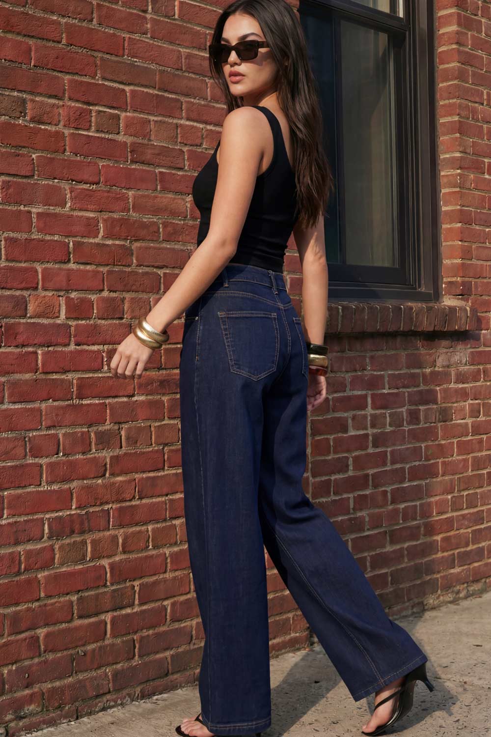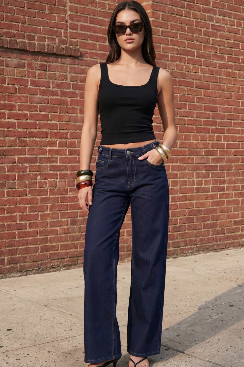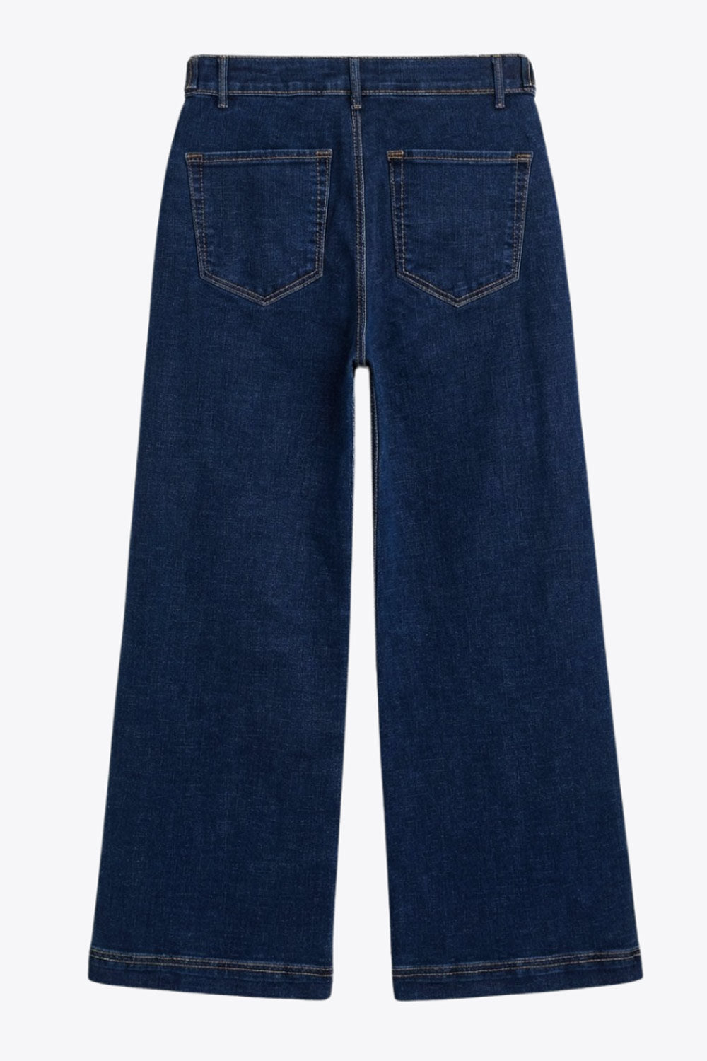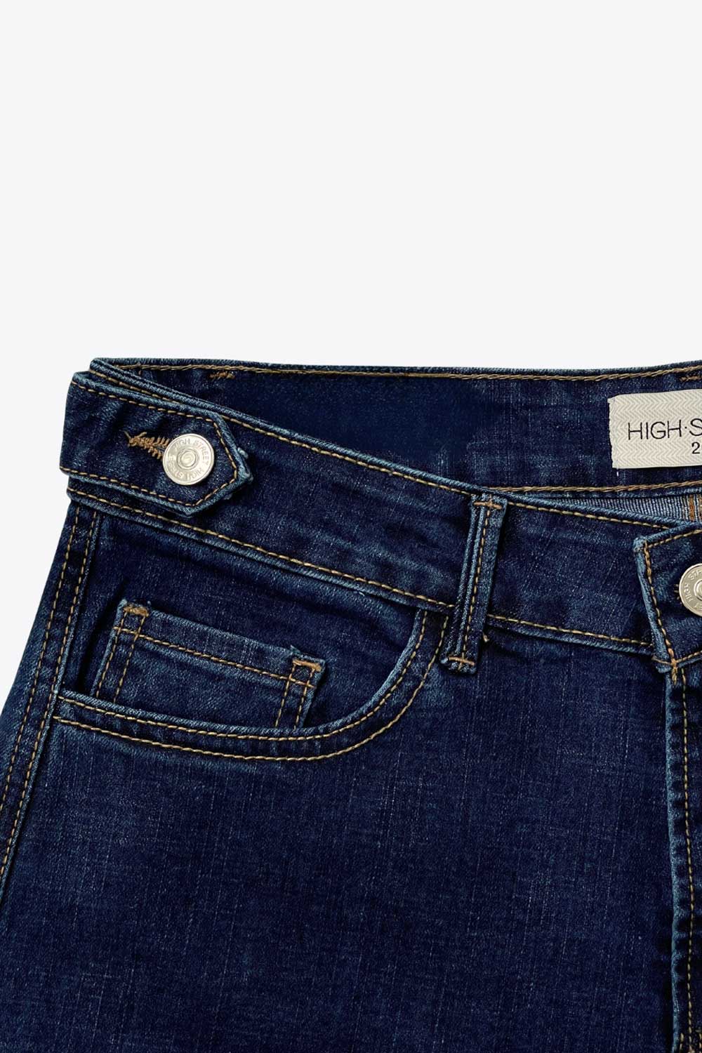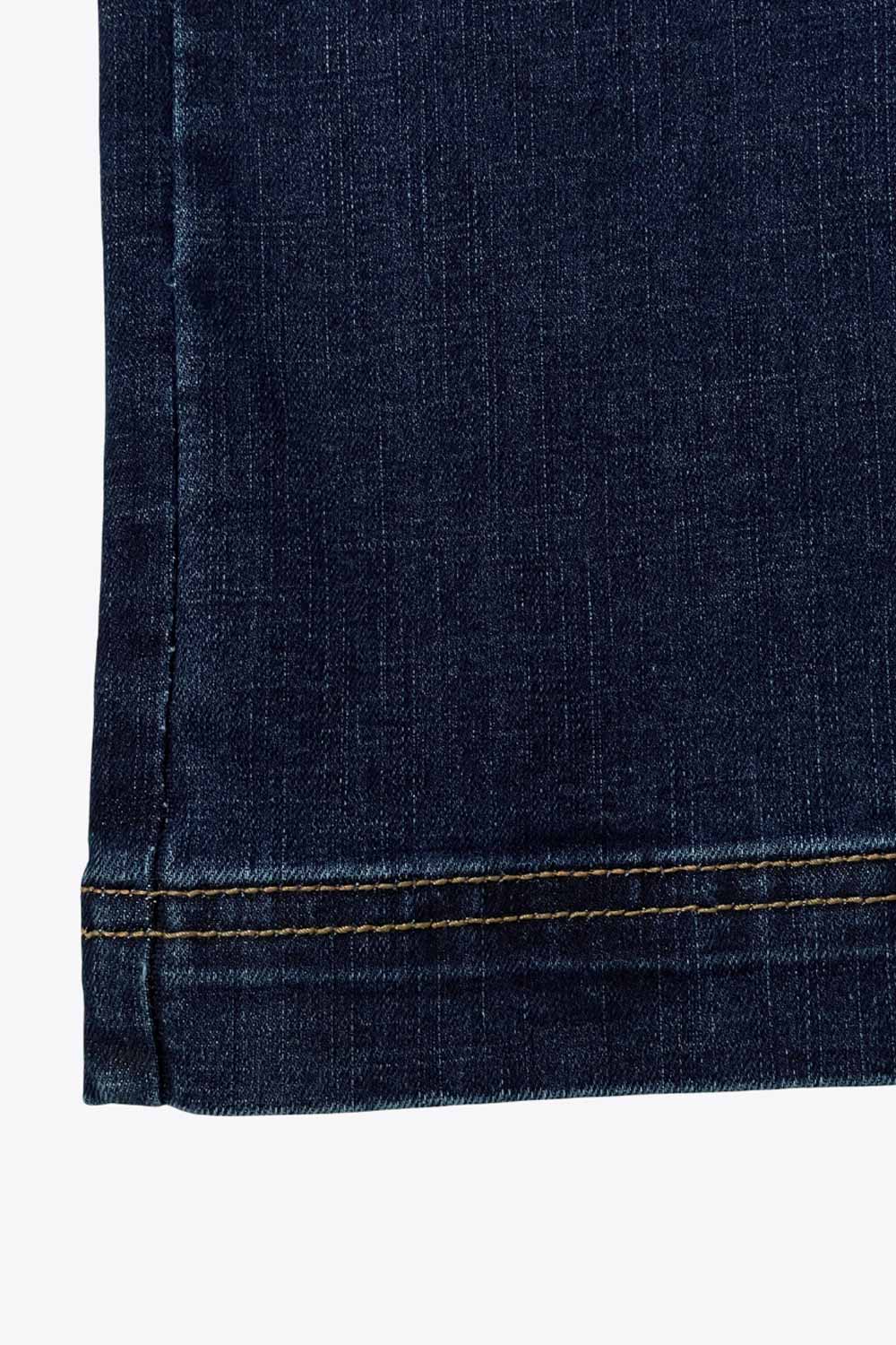 Pantalón de denim, fit recto, cintura media con pretina y trabillas, bolsillos delanteros y traseros de parche. Cierre frontal con botón y cremallera oculta. Detalle de trabillas con botón en pretina.
