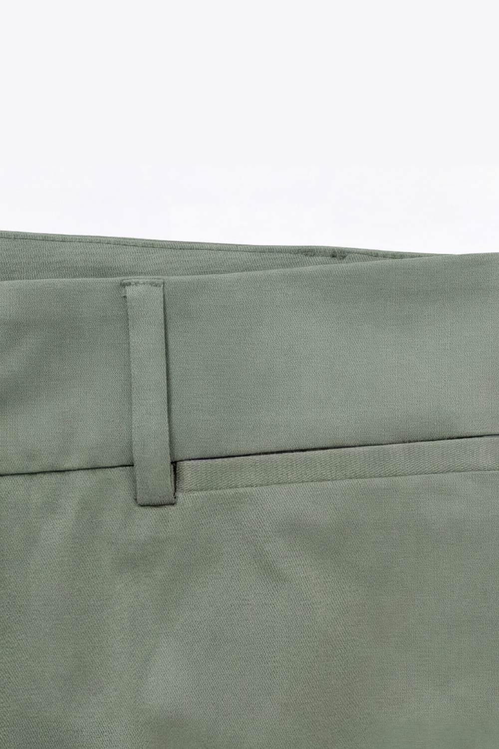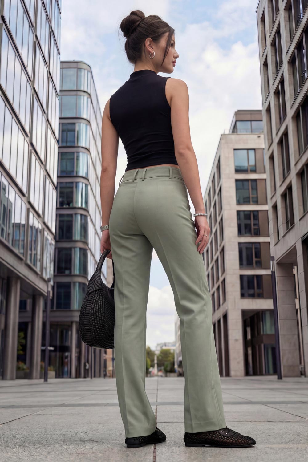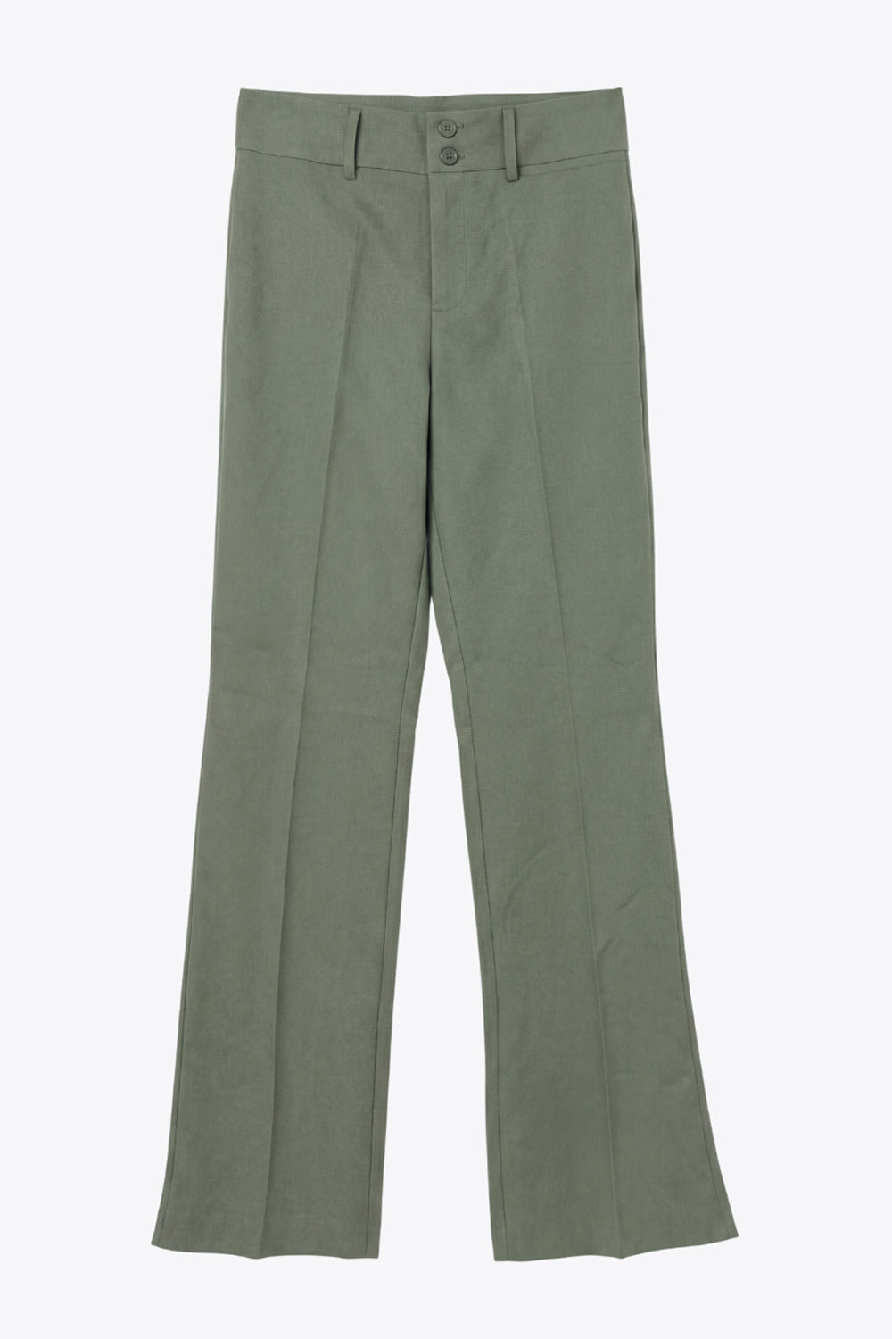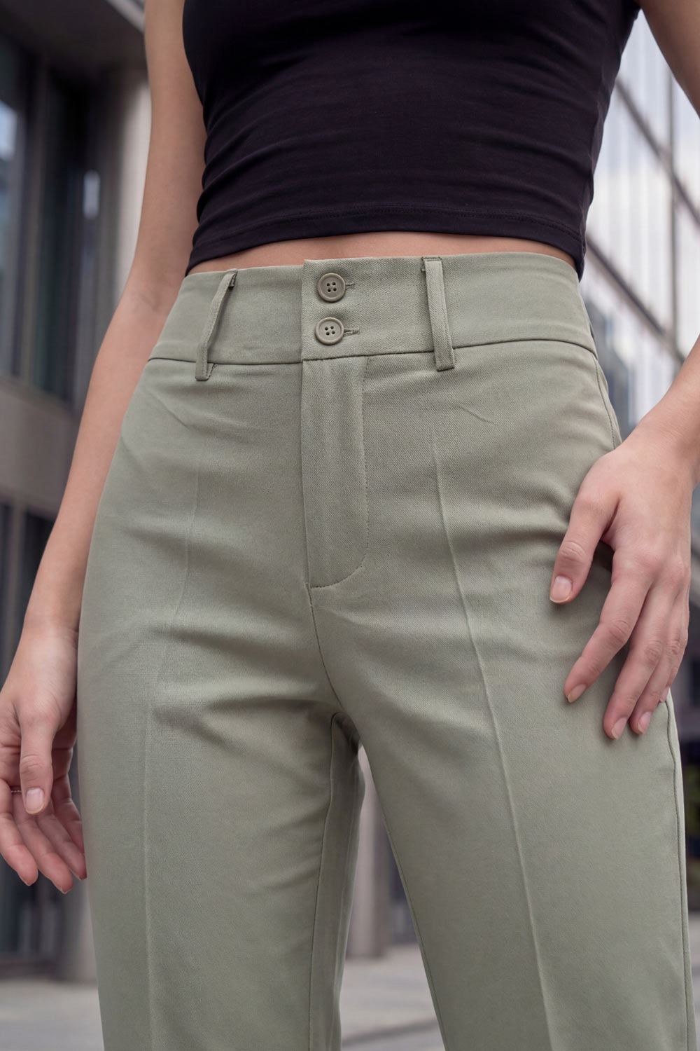 Pantalón ajustado de fit flare, cintura alta con pretina y trabillas, raya frontal y posterior, cierre con cremallera oculta y botones.