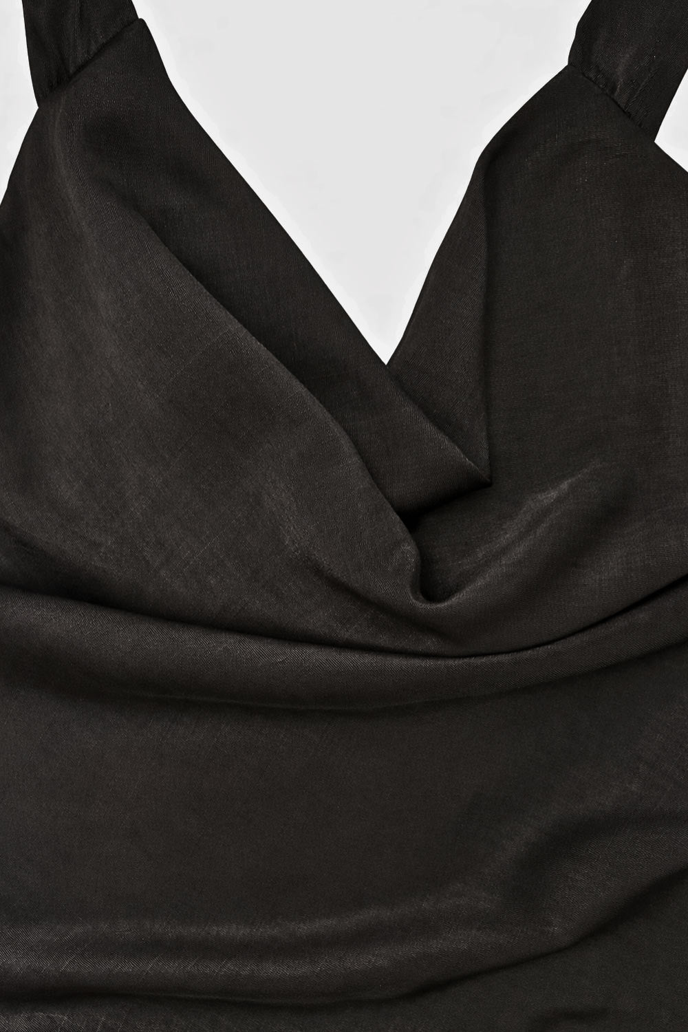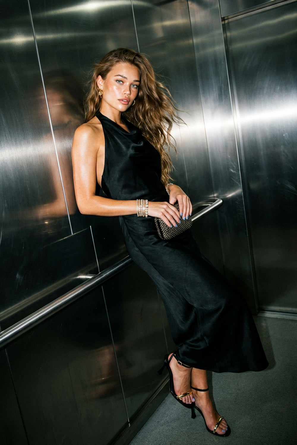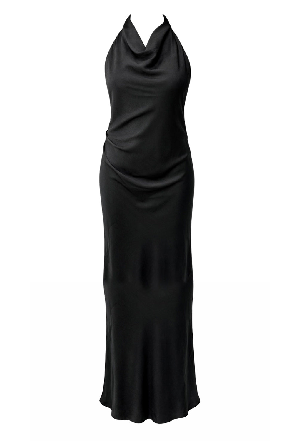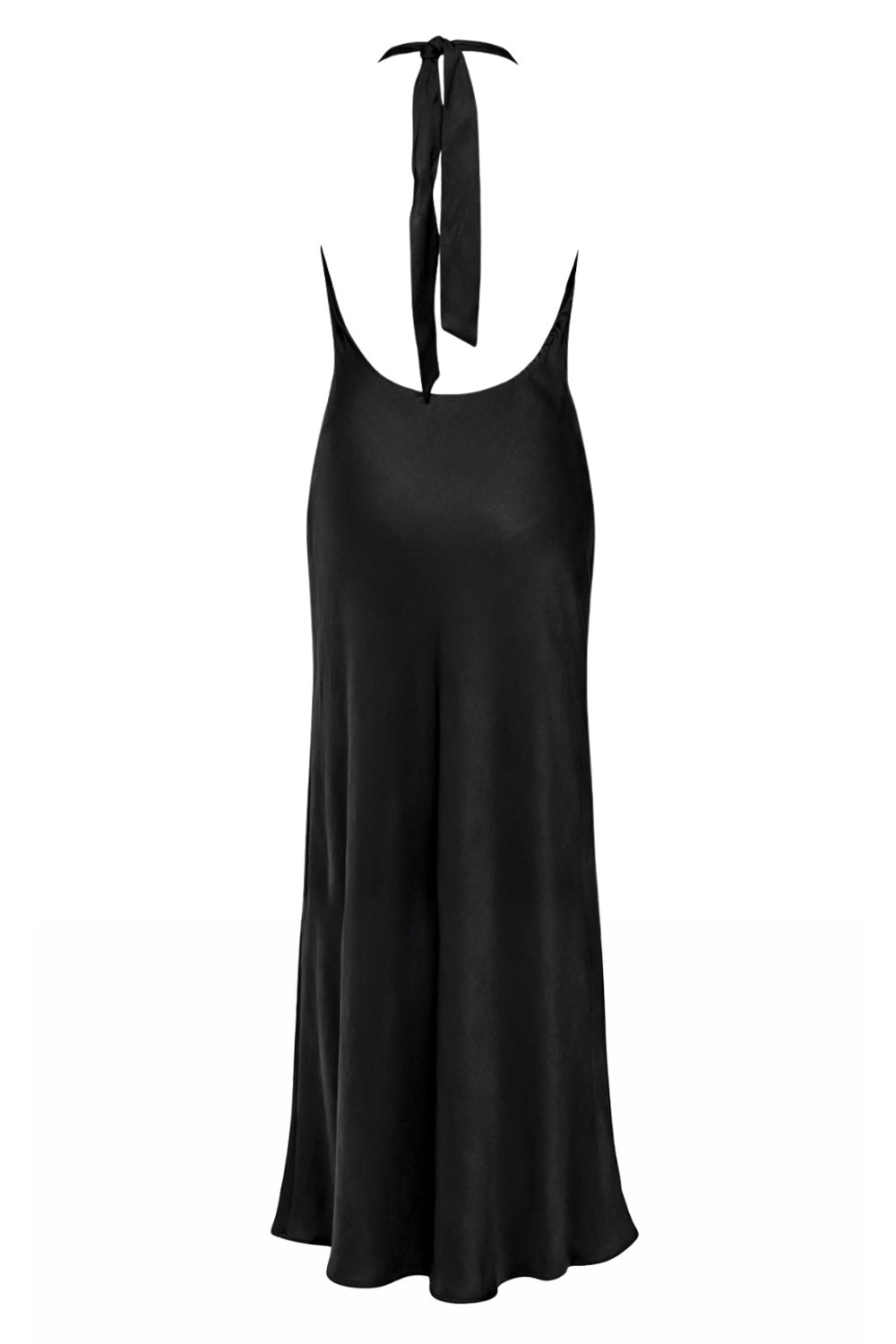 Vestido largo satinado de fit fluido, cuello halter con lazo amarrable posterior, escote en espalda y frontal fluido.