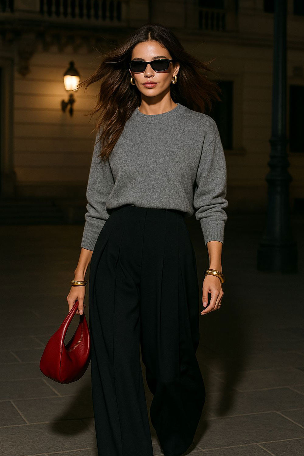 Pantalón de fit wide leg, cintura alta, pinzas frontales con raya, vivos decorativos posteriores, cierre frontal con broche y cremallera ocultos.