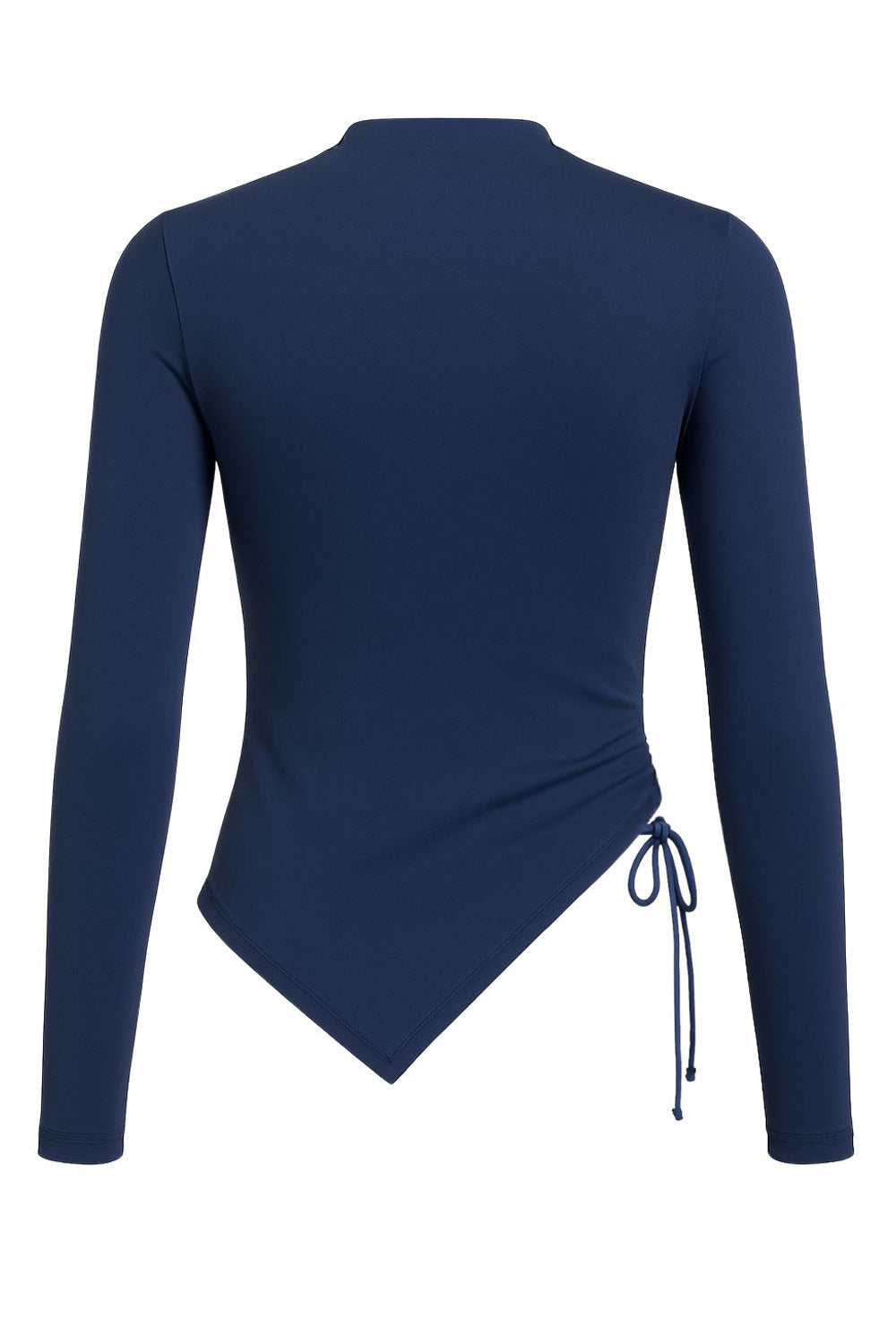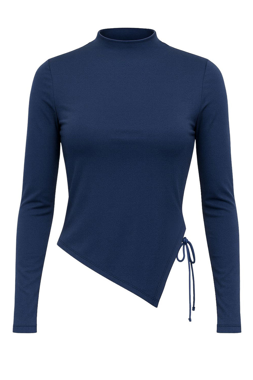Top corto de fit ajustado, cuello mock seguido, manga larga y bajo diagonal asimétrico con jareta lateral ajustable.