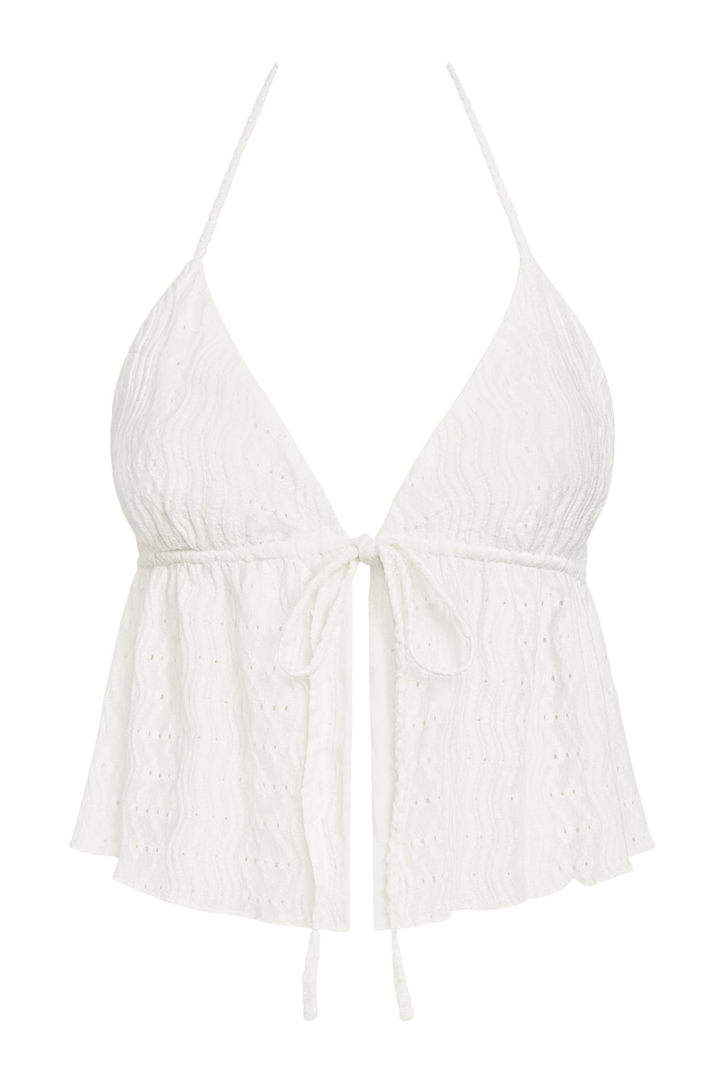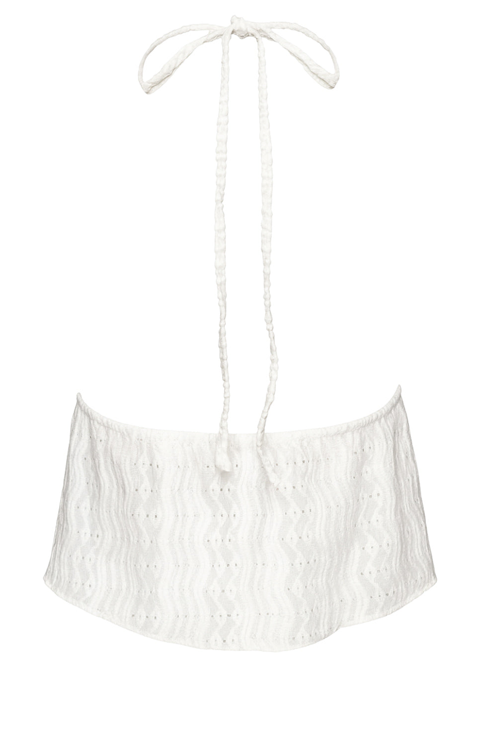 Top corto de escote v con lazo amarrable frontal, rib elástico en espalda, tirantes halter con lazo amarrable posterior y abertura frontal en bajo. Detalle de peplum olanes en bajo y textura en tejido.
