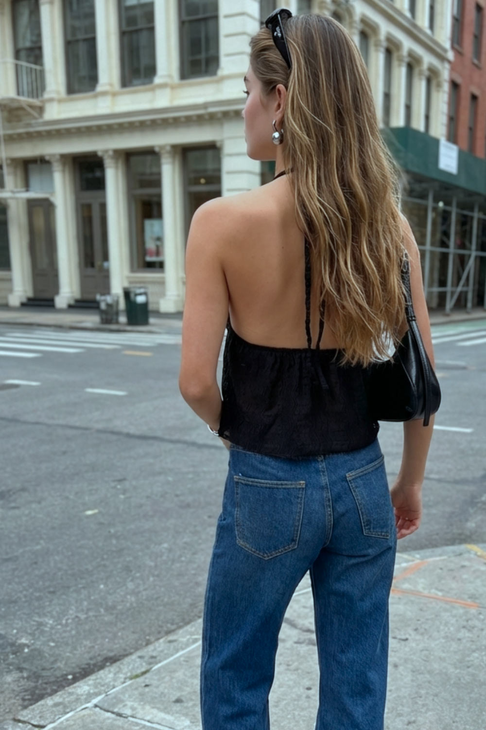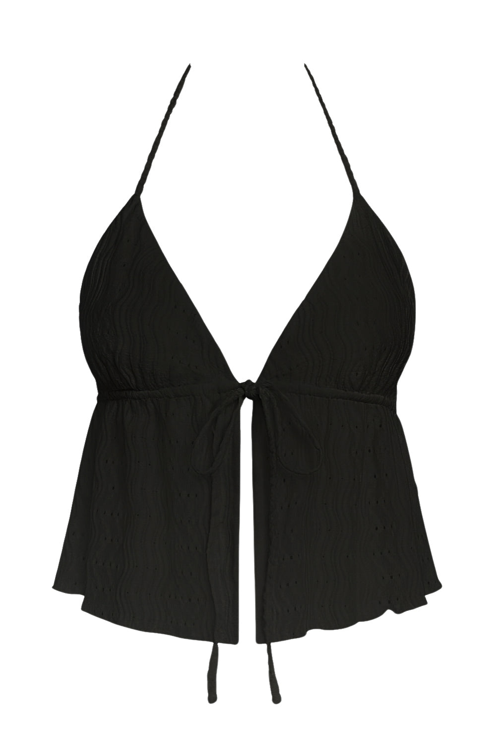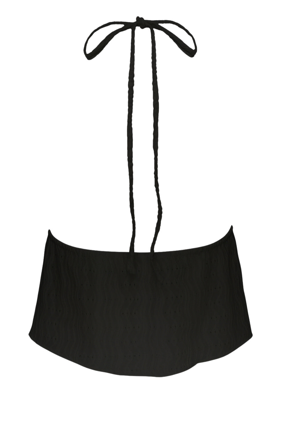 Top corto de escote v con lazo amarrable frontal, rib elástico en espalda, tirantes halter con lazo amarrable posterior y abertura frontal en bajo. Detalle de peplum olanes en bajo y textura en tejido.