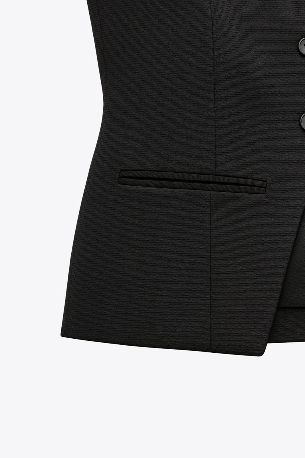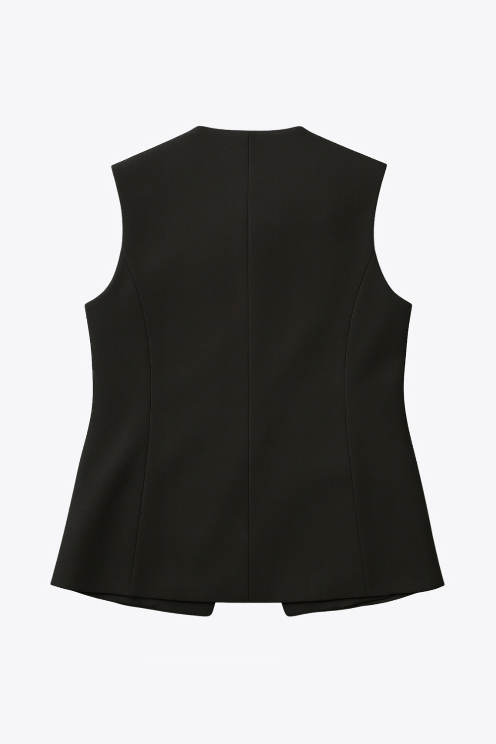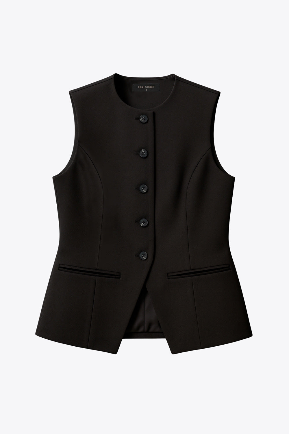 Chaleco de punto, fit recto, cuello redondo, bajo frontal con abertura en v y cierre frontal con hilera de botones. Detalle de vivos decorativos frontales.
