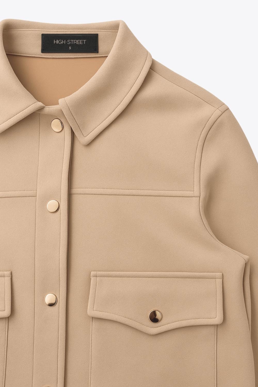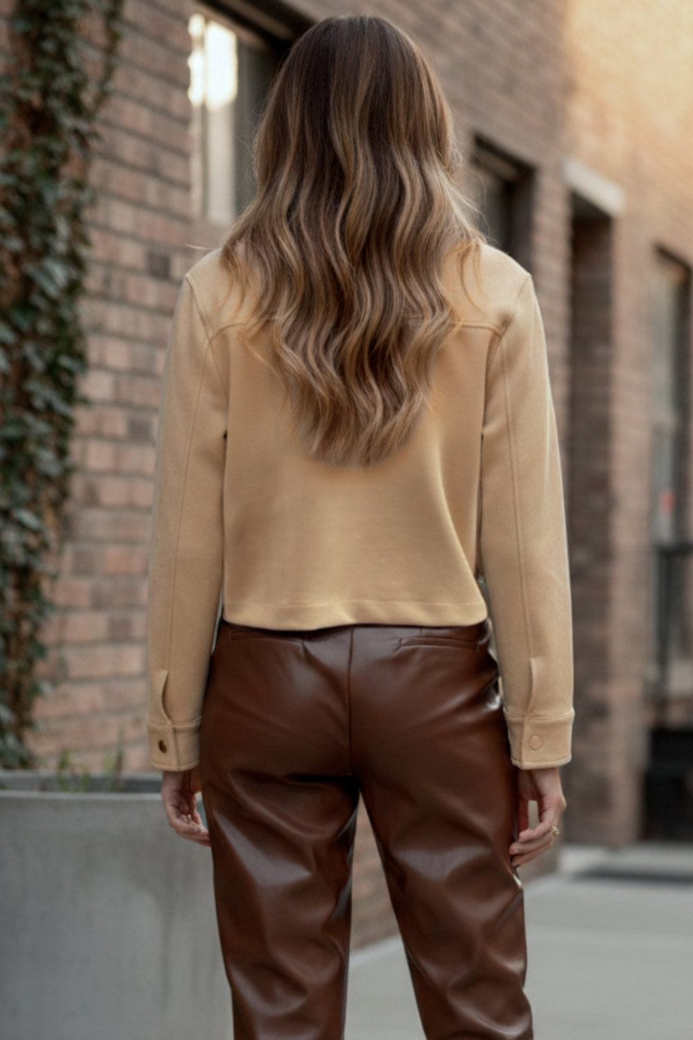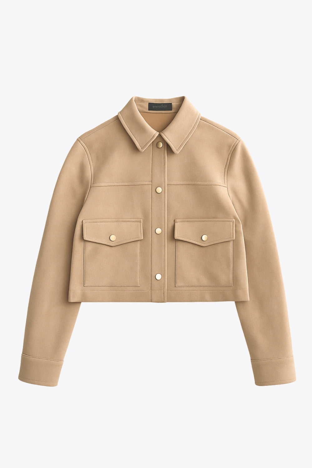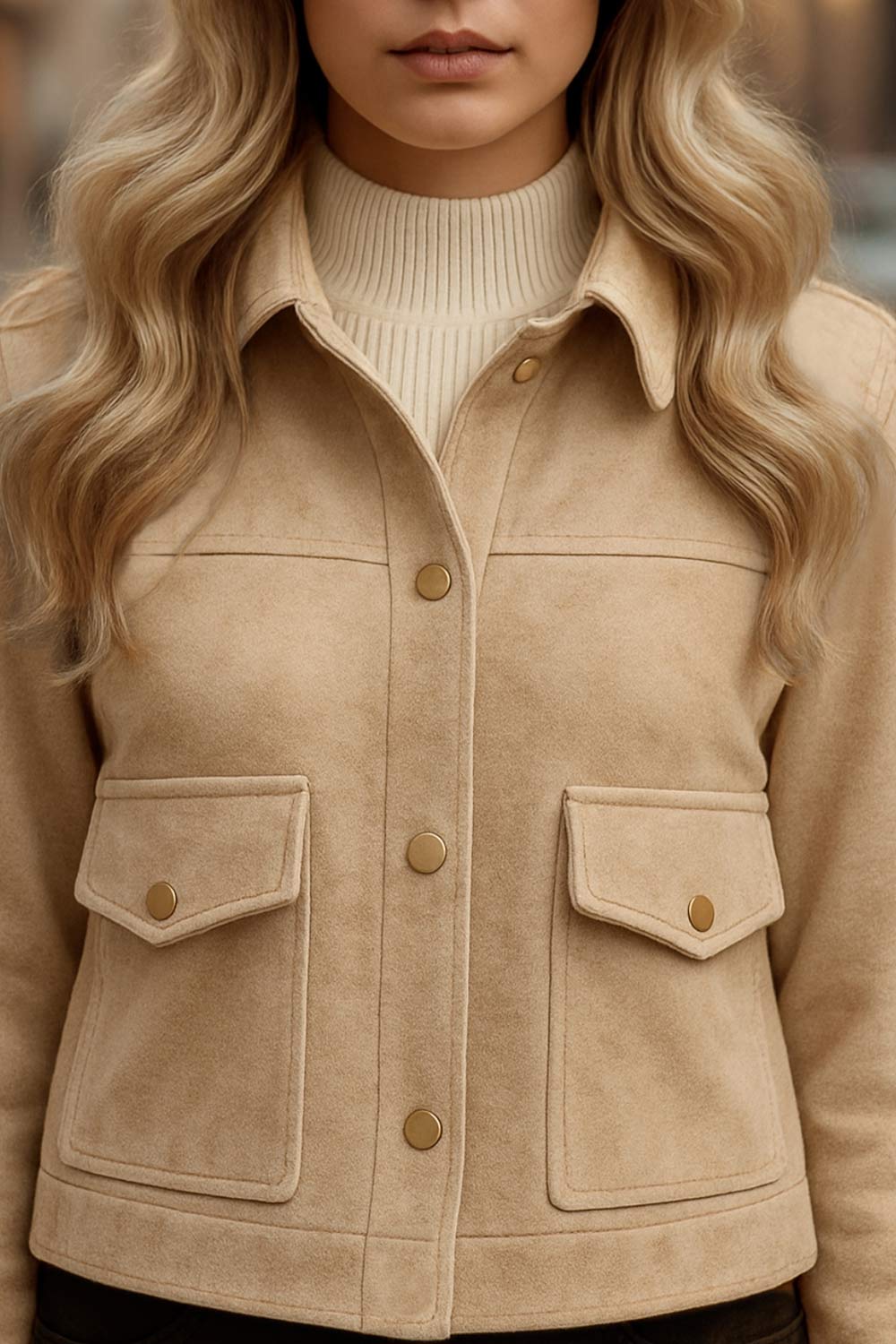 Chamarra corta de gamuza, fit recto, manga larga con puño abotonado, cuello camisero, bolsillos delanteros de parche con cartera y botones de presión. Cierre frontal con hilera de botones en contraste.