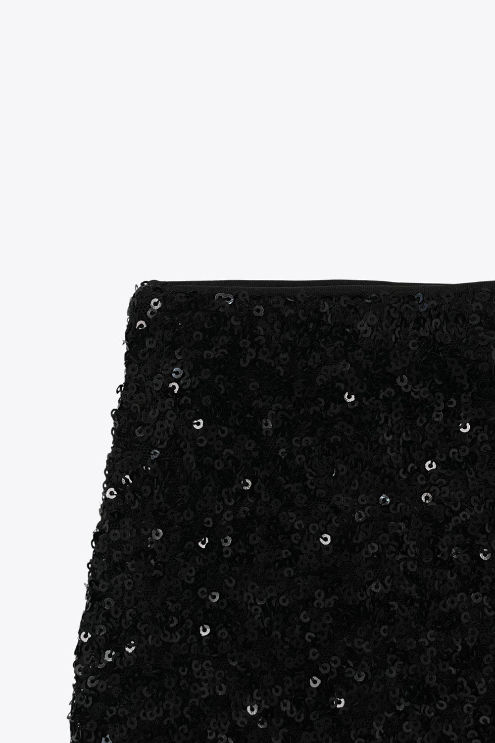 Falda corta de lentejuelas, fit ajustado y cintura alta elástica.