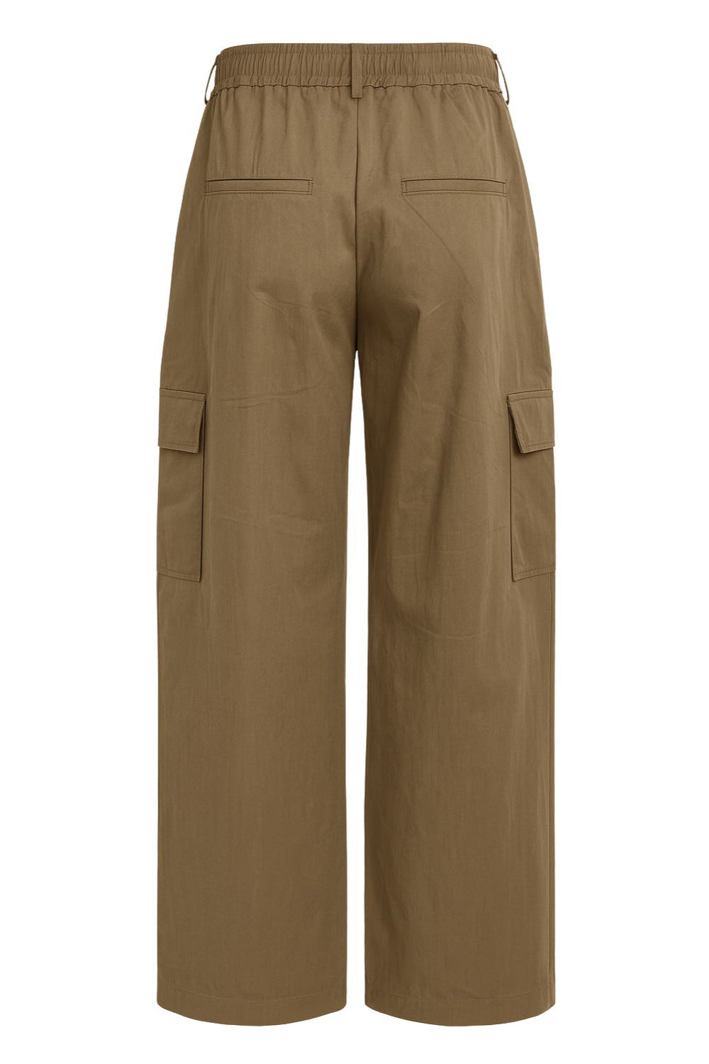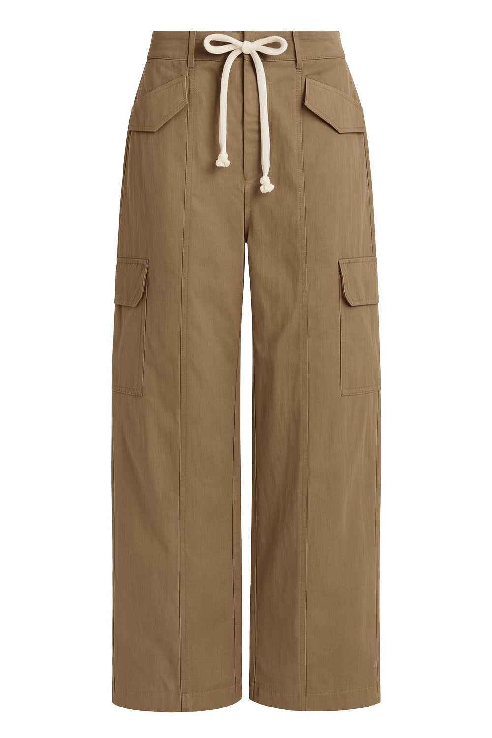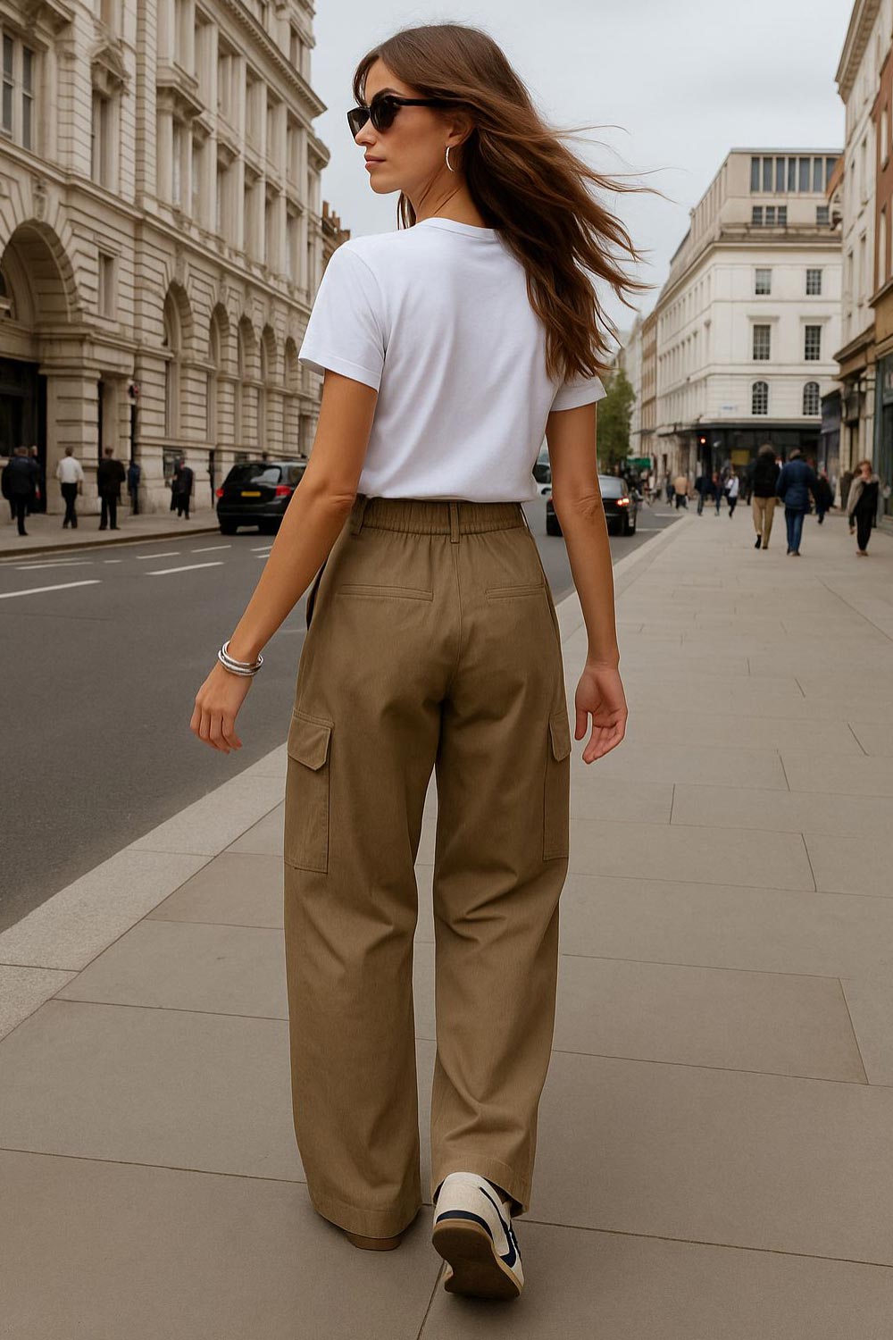 Pantalón cargo de fit recto, cintura alta con pretina y trabillas, bolsillos delanteros y laterales cargo con cartera, vivos posteriores, pretina elástica posterior y costura frontal decorativa. Detalle de jareta frontal ajustable en contraste y cierre con cremallera oculta.