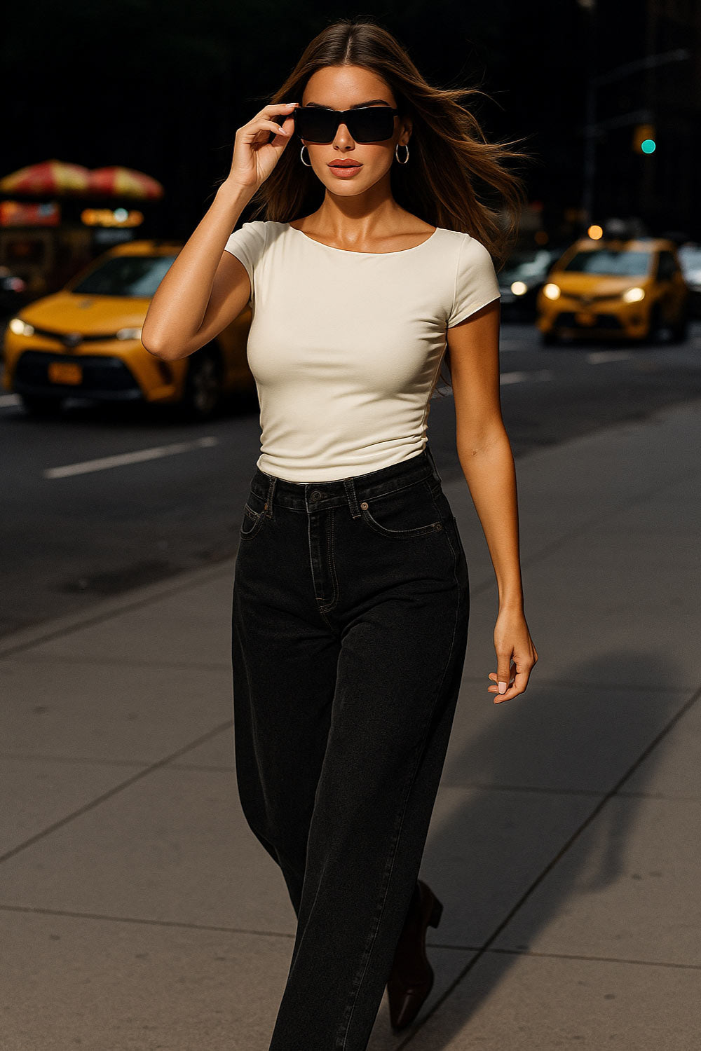 Top de fit ajustado, manga corta, cuello barco y escote en espalda con lazo amarrable posterior.