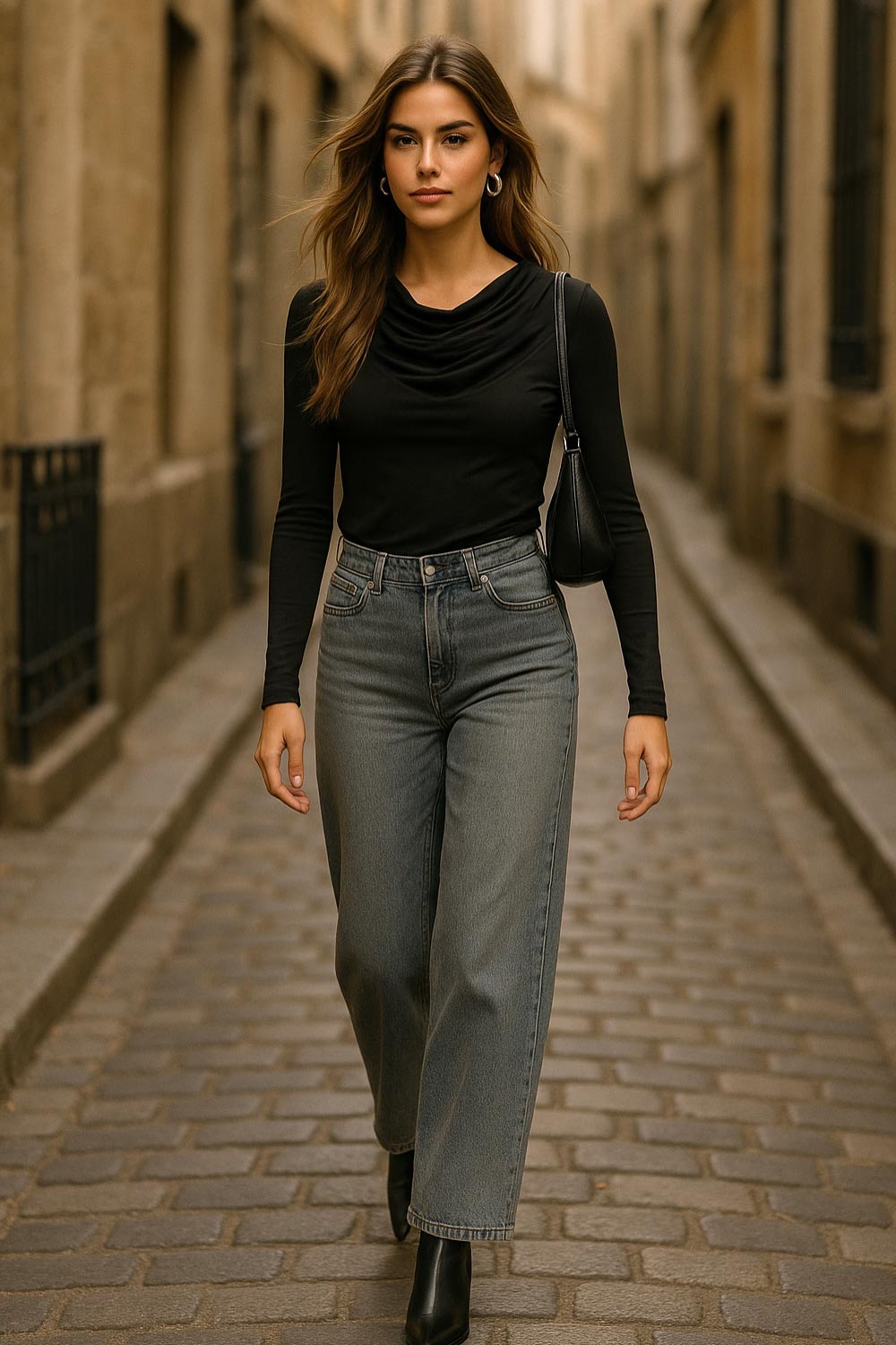 Top de fit ajustado, cuello barco con escote fluido, plisados en hombros y manga larga.