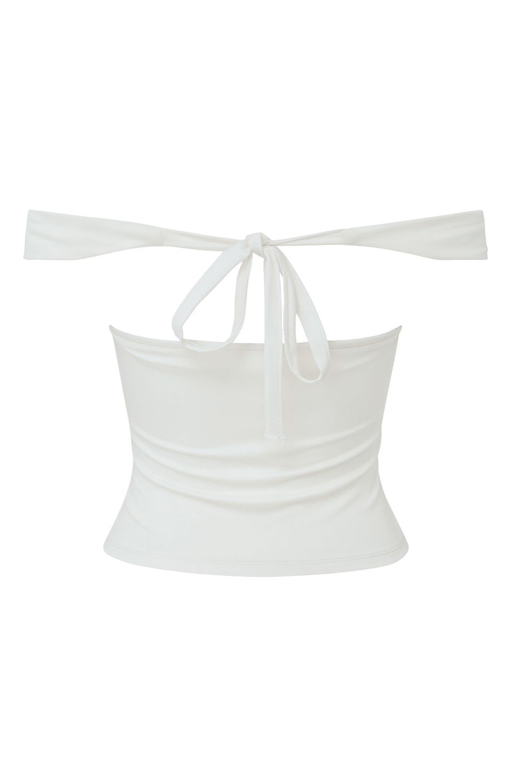 Top corto de fit ajustado, hombros descubiertos, manga corta seguida y detalle de cut out en espalda con lazo amarrable posterior.
