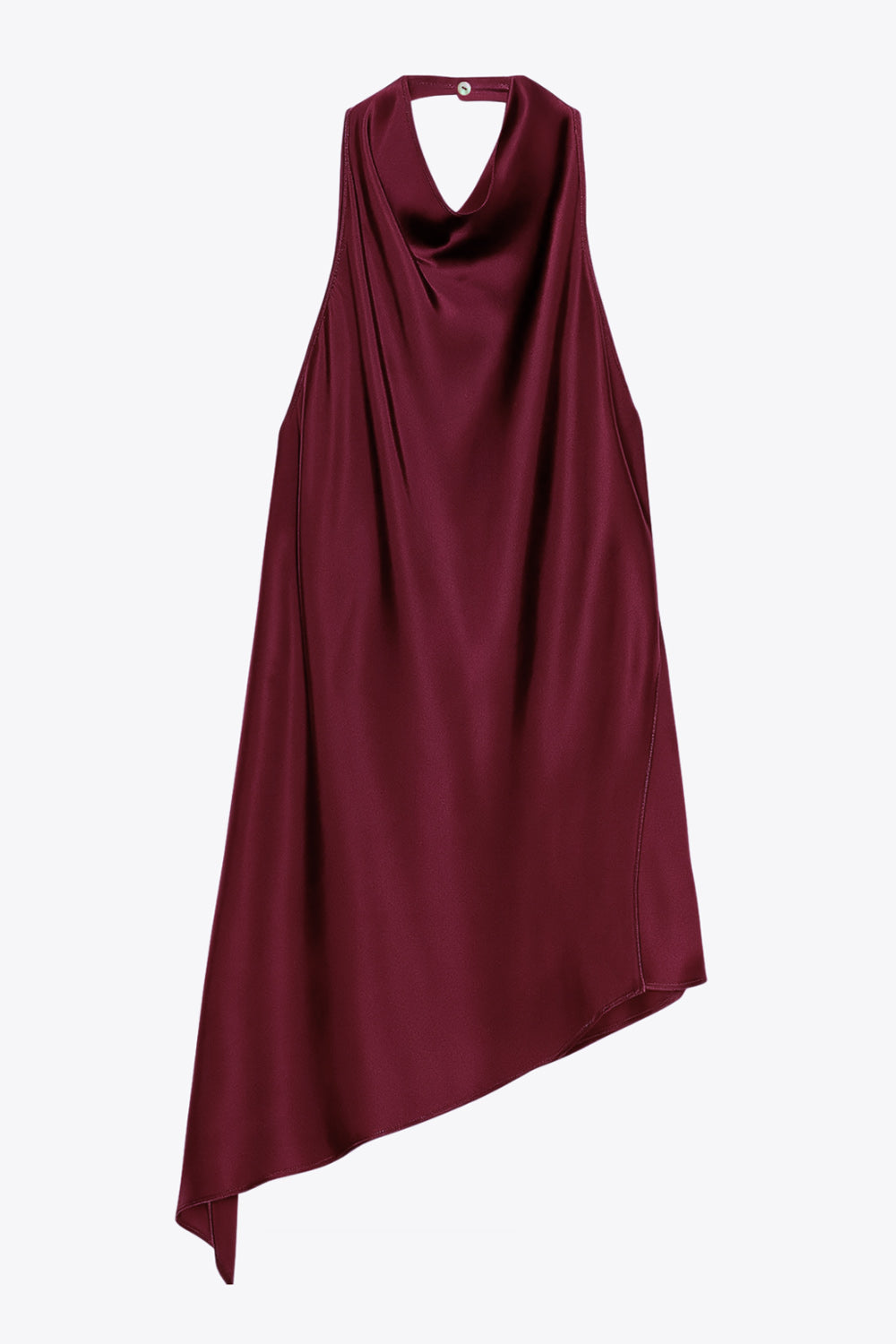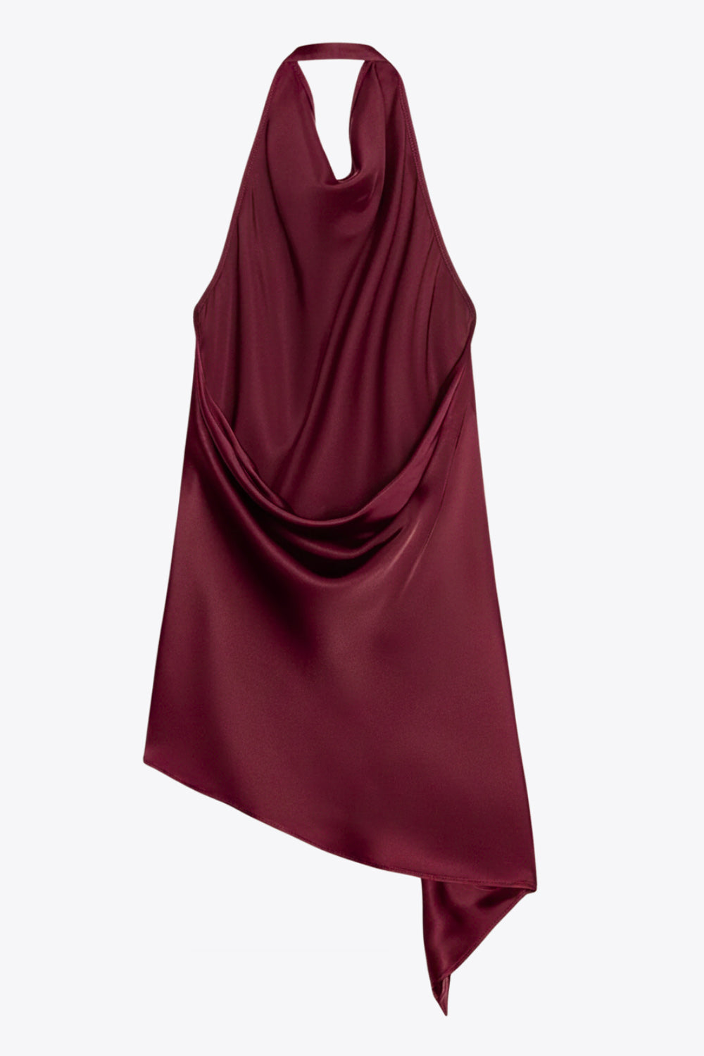 Blusa larga satinada, de fit fluido, sin mangas, cuello halter fluido, escote en espalda, bajo asimétrico y cierre posterior con botón y ojal.
