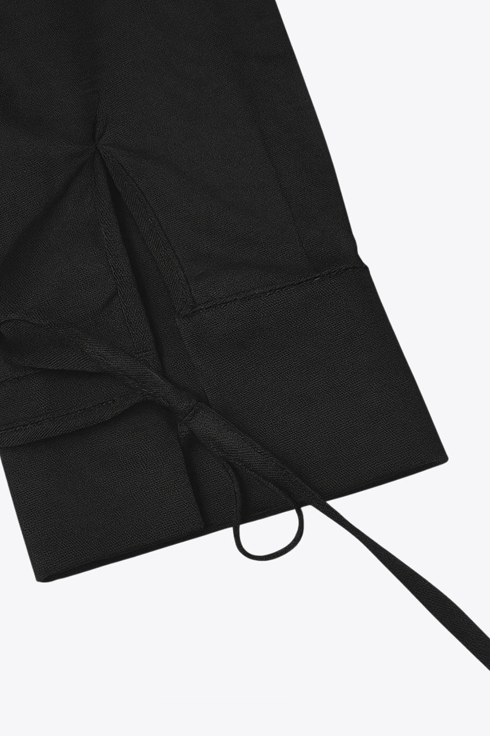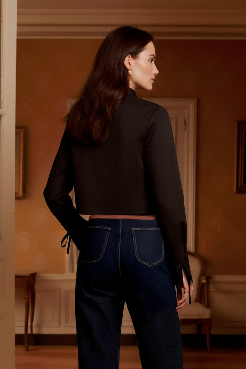 Camisa corta de fit recto, manga larga con puño y lazado decorativo, cuello mao y cierre frontal con lazado amarrable.
