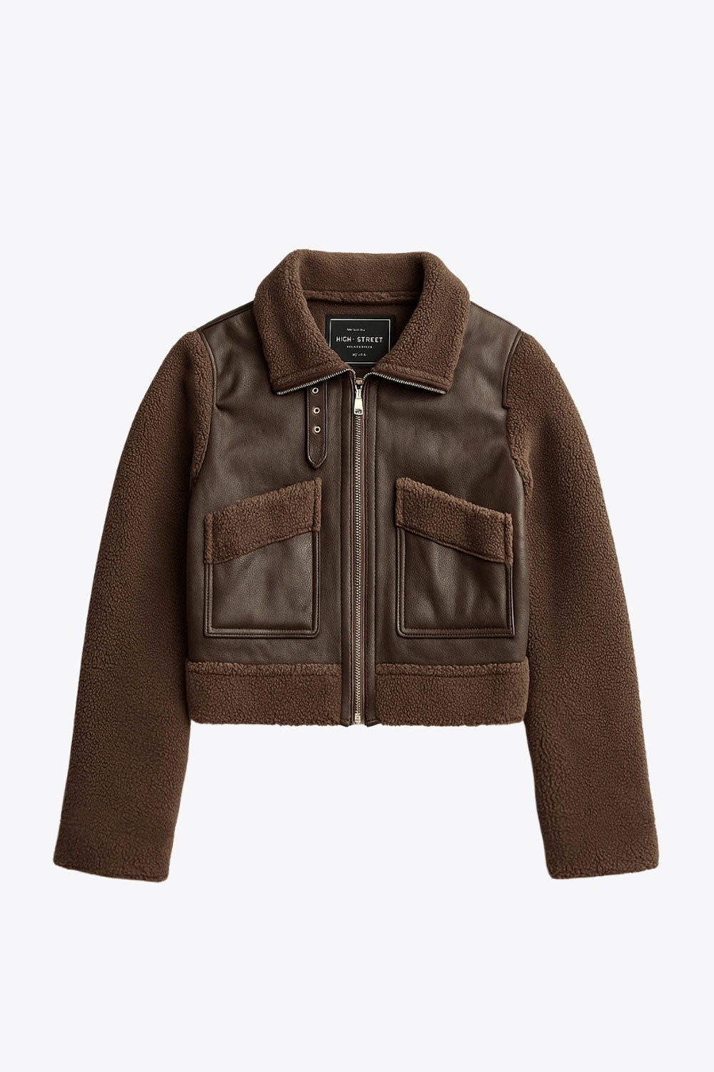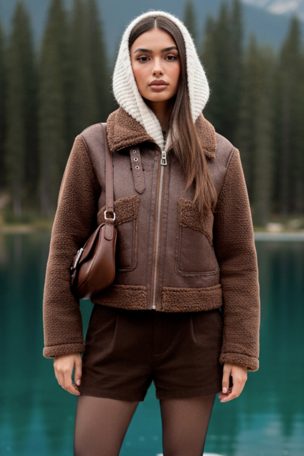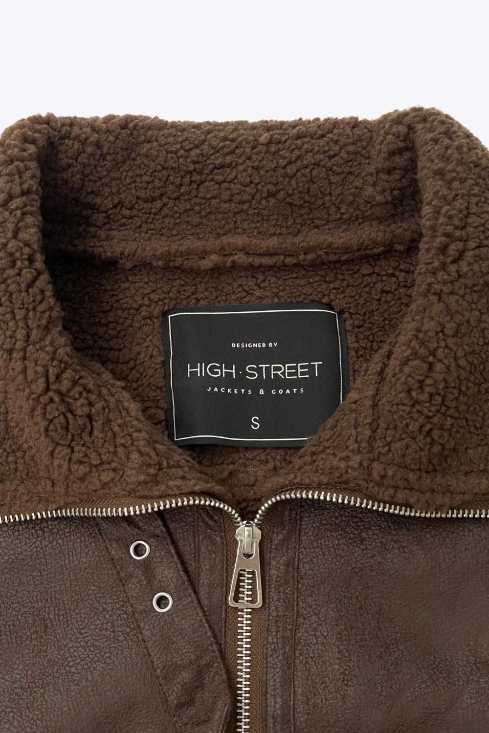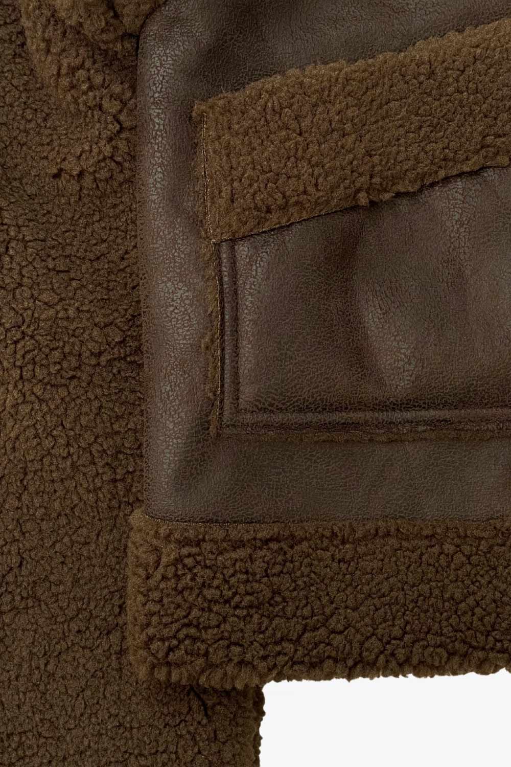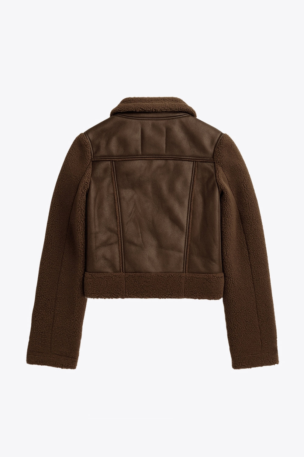 Chamarra corta de efecto piel, interior, mangas y cuello solapa de borreguillo, bolsillos delanteros de parche con detalle en contraste, fit recto, manga larga, costuras decorativas y cierre frontal con cremallera en contraste. Detalle de trabilla decorativa con hebilla en cuello.