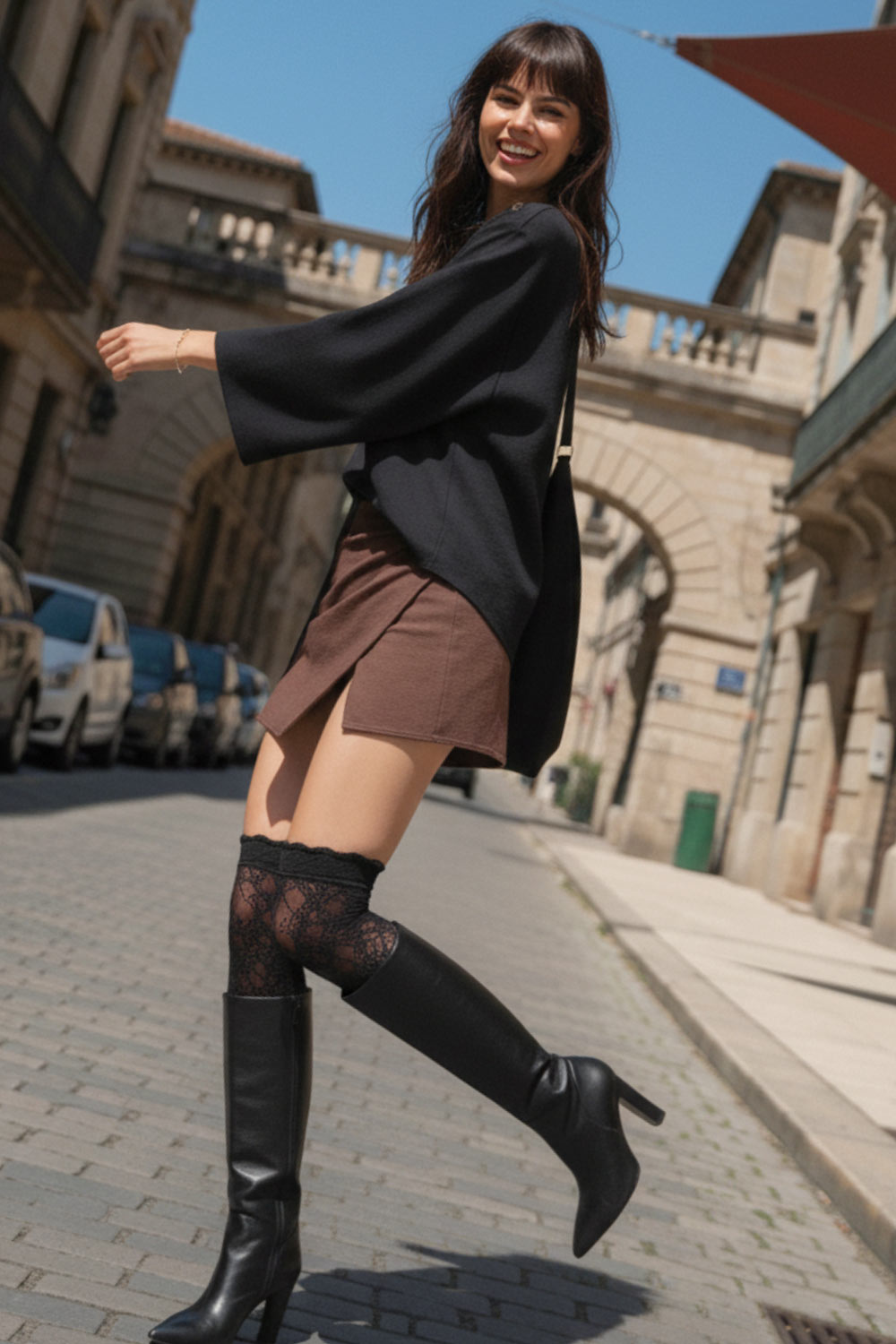 Falda short corto de cintura alta, corte en a, cruce frontal con plisados frontales y cierre lateral con cremallera oculta.