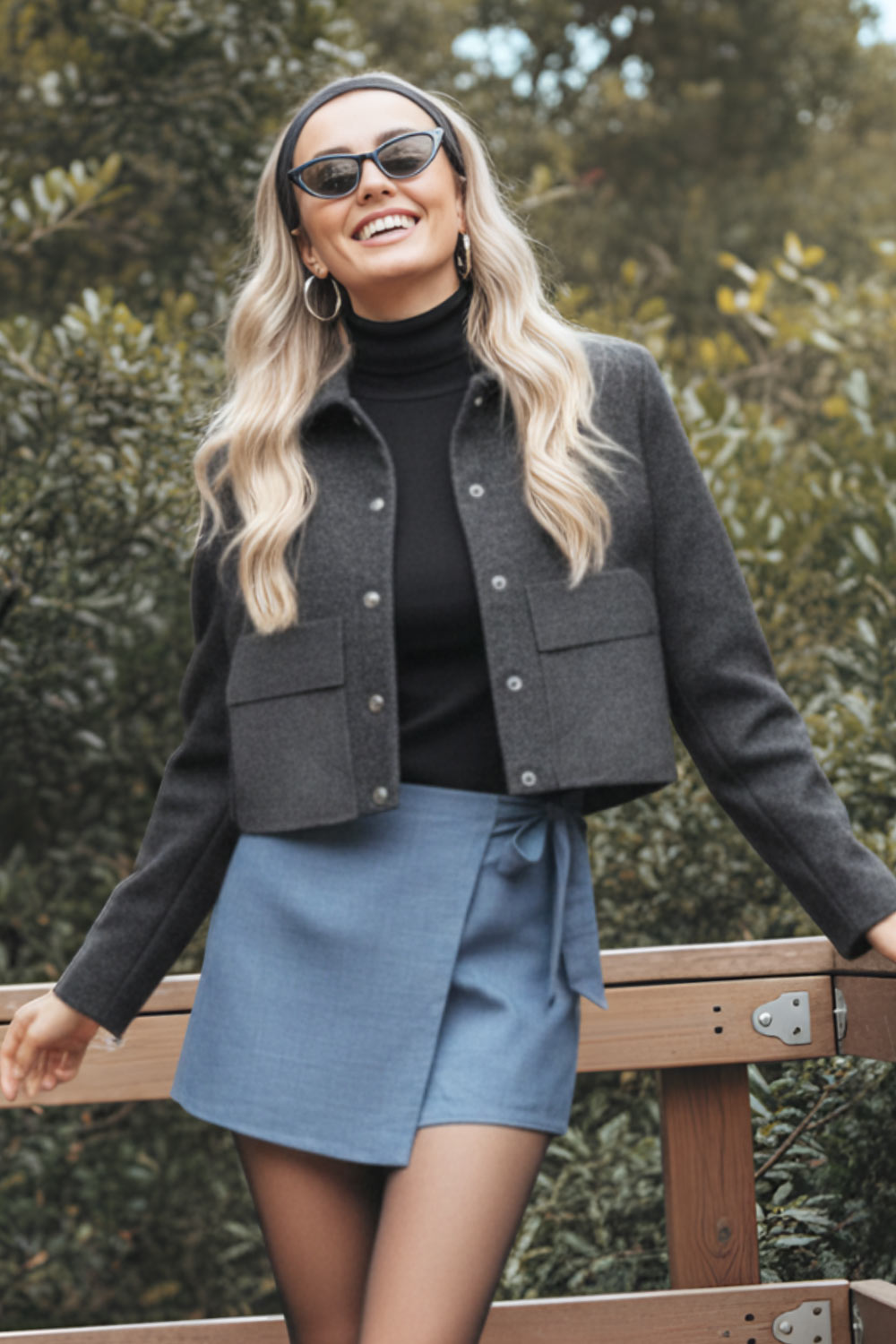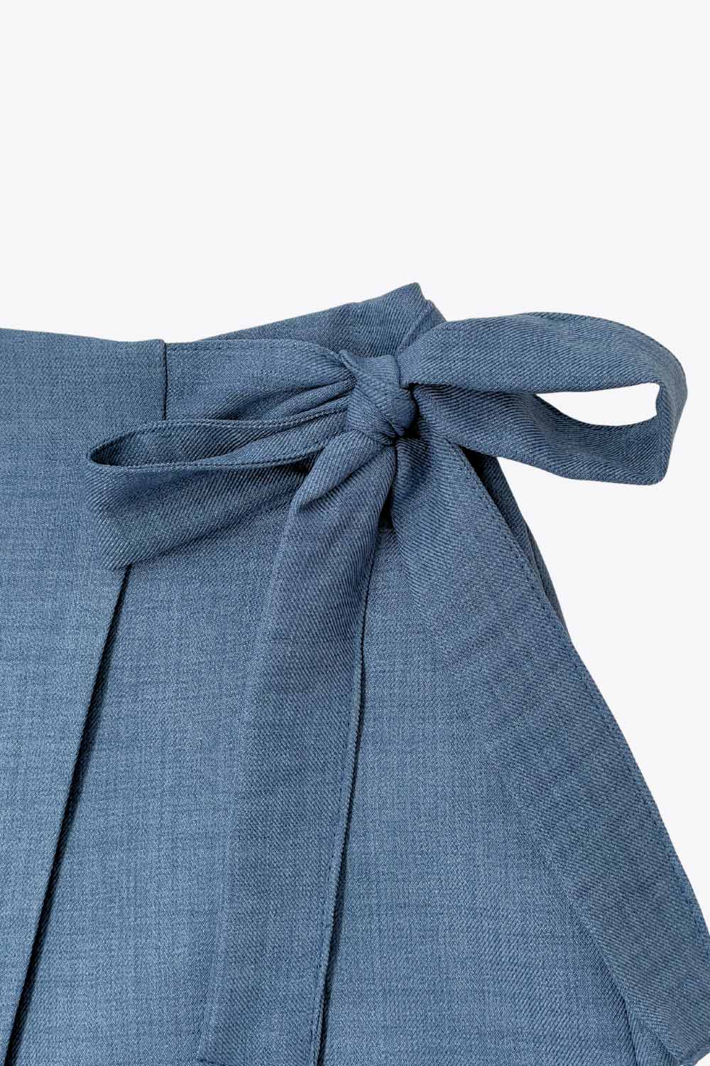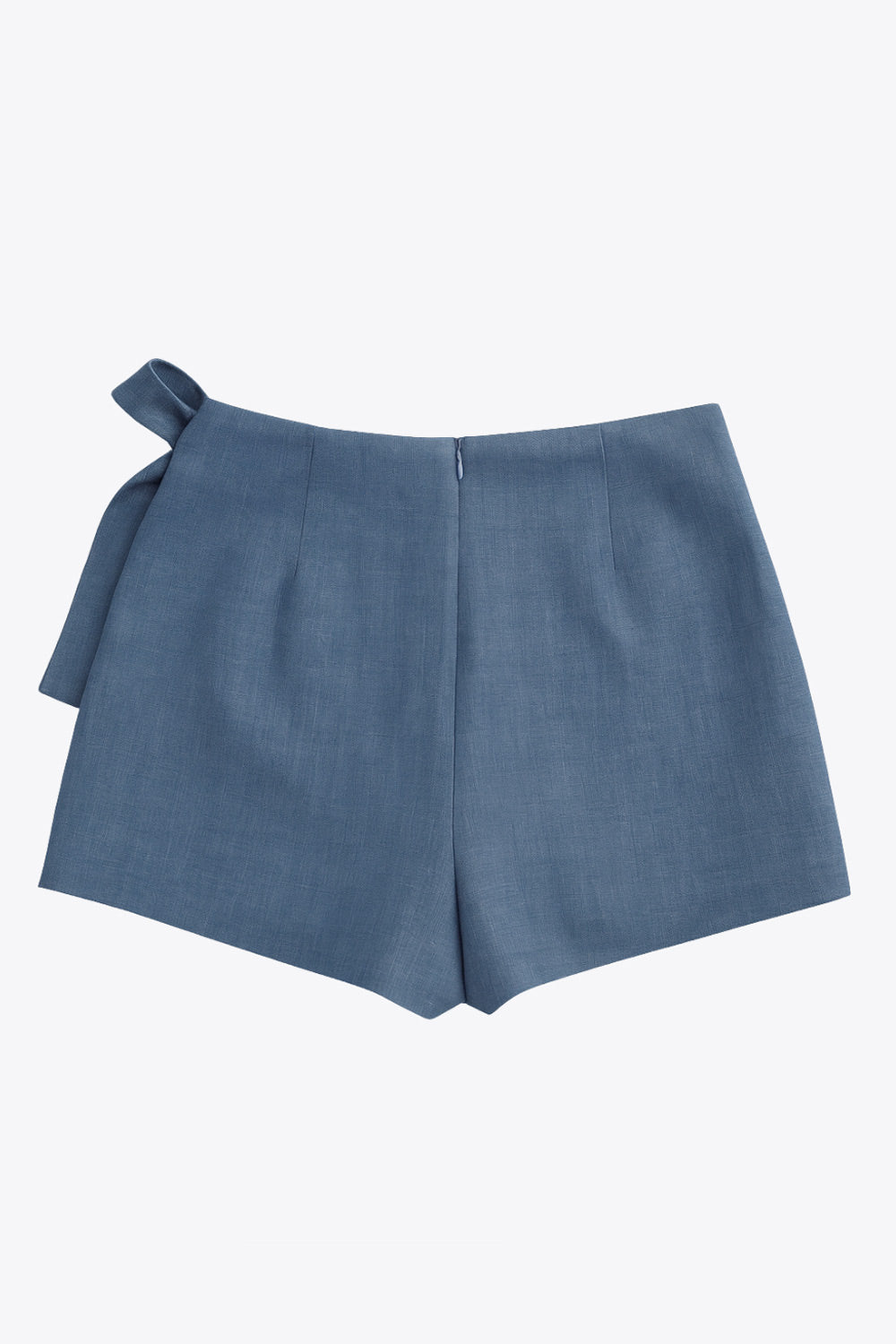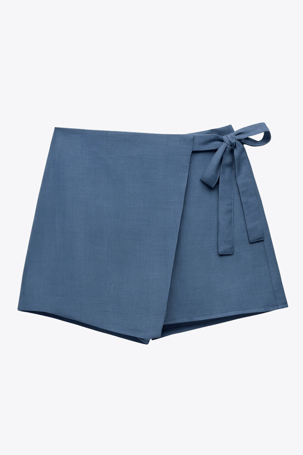 Falda short corto de cintura alta, corte en a, sobrefalda con cruce frontal, lazo lateral amarrable y cierre posterior con cremallera oculta.