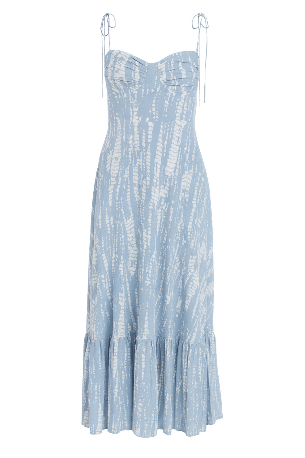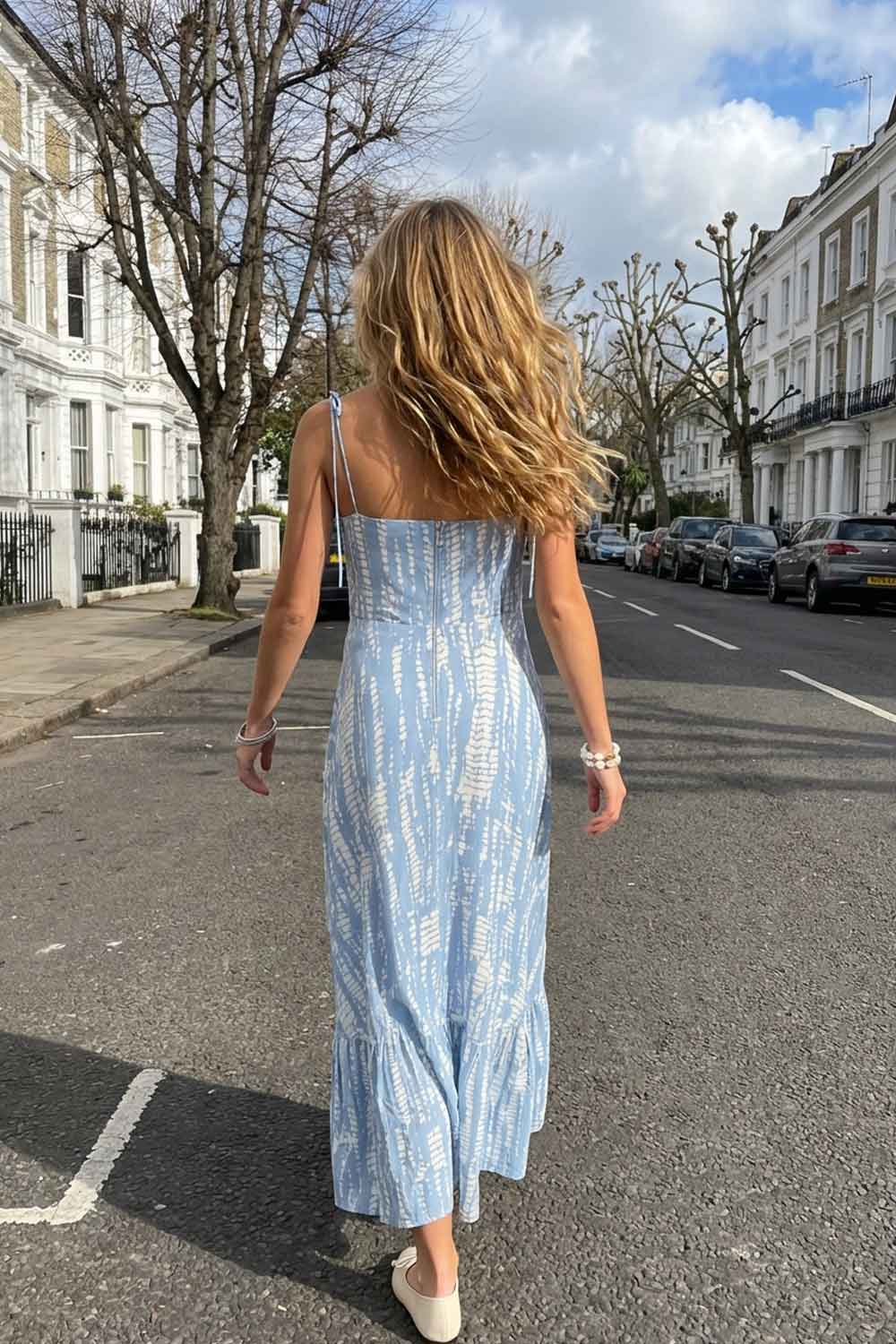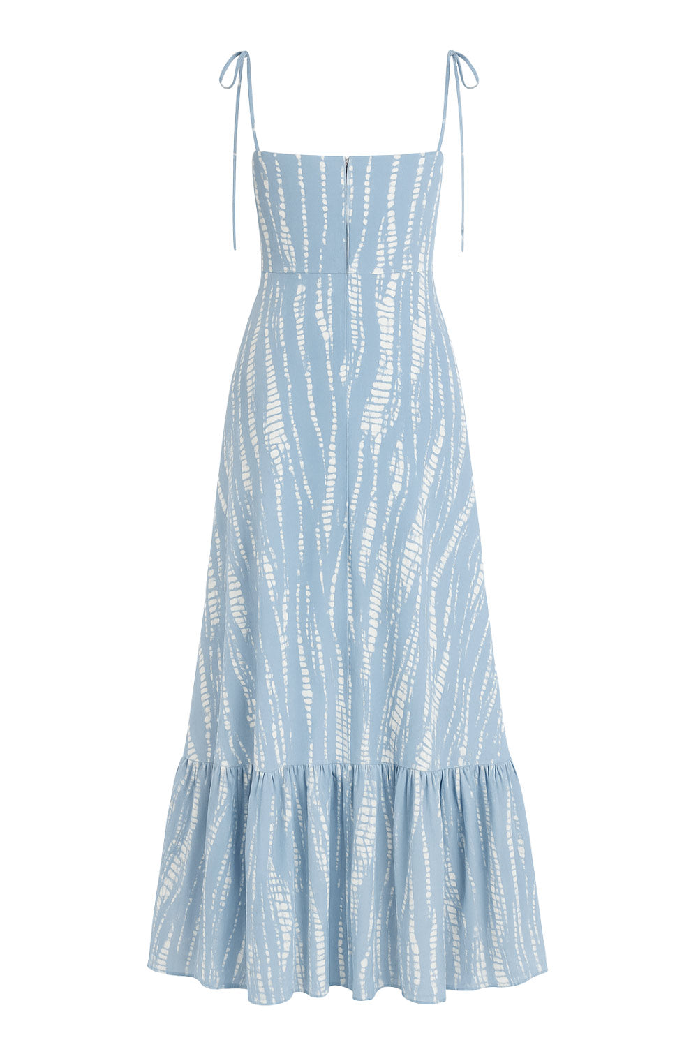 Maxi vestido estampado de corte en a, tirantes delgados con nudo amarrables, escote corazón con cortes y detalles plisados. Cierre posterior con cremallera visible en contraste y olanes en borde de bajo.