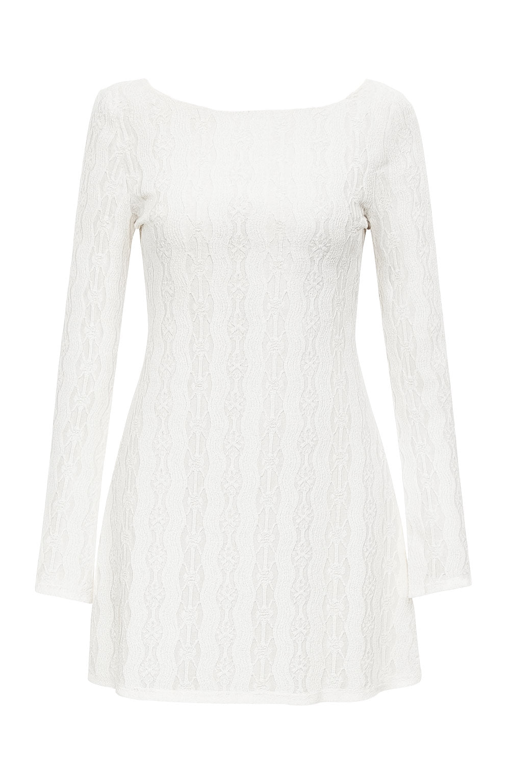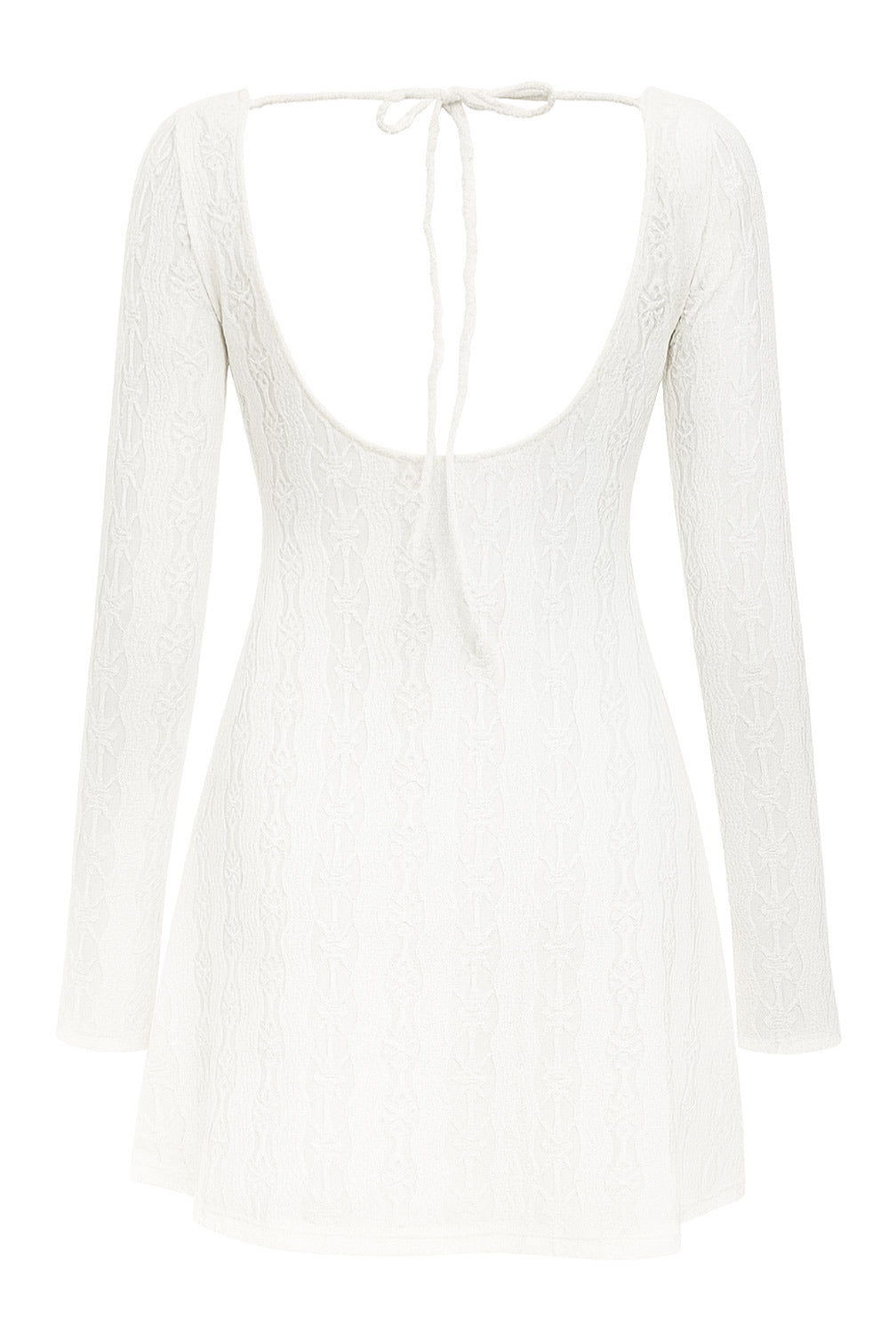 Vestido corto de fit ajustado, manga larga, cuello barco y escote en espalda con lazo amarrable posterior. Detalle de textura en tejido.