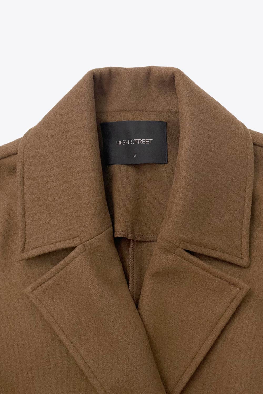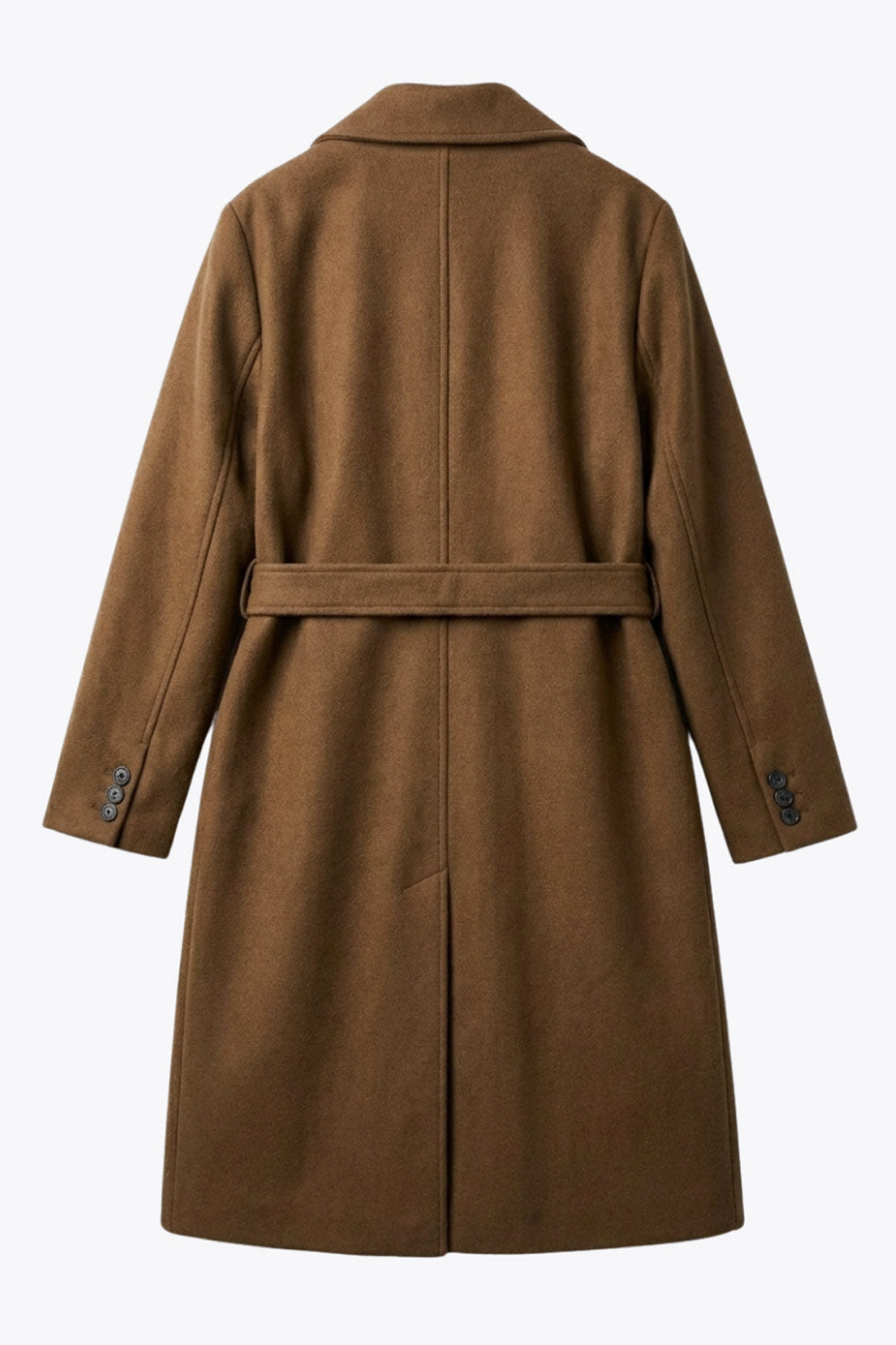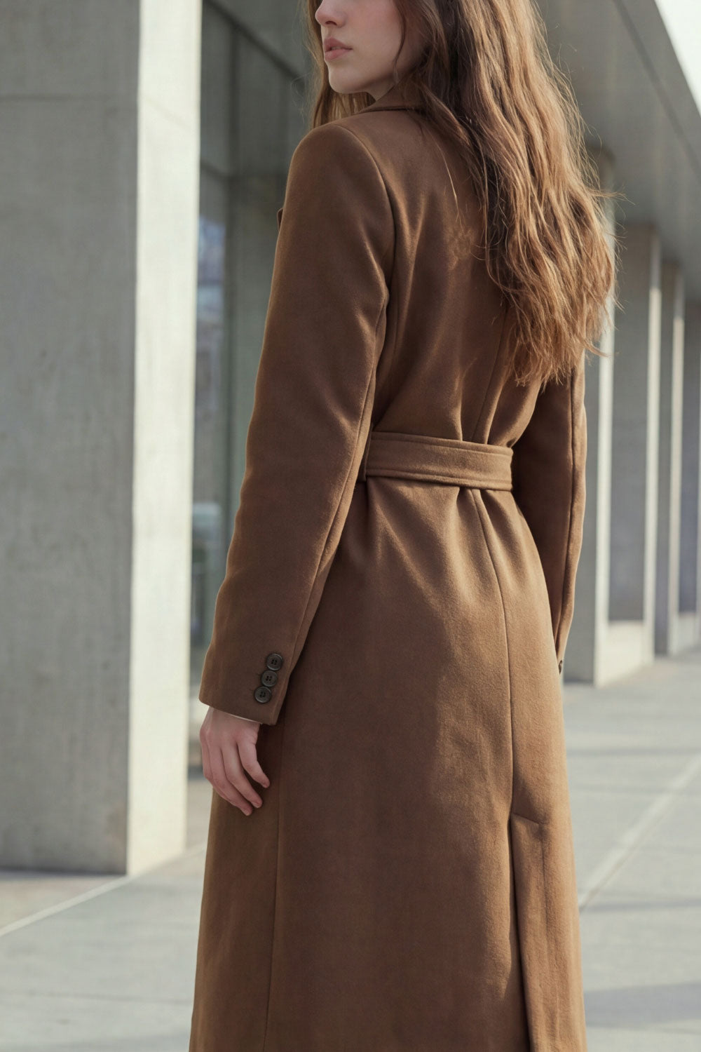 Abrigo largo con cruce de botón en contraste, fit recto, manga larga con puño abotonado, con solapa, trabillas y cinturón amarrable del mismo tejido. Detalle de abertura posterior en bajo.