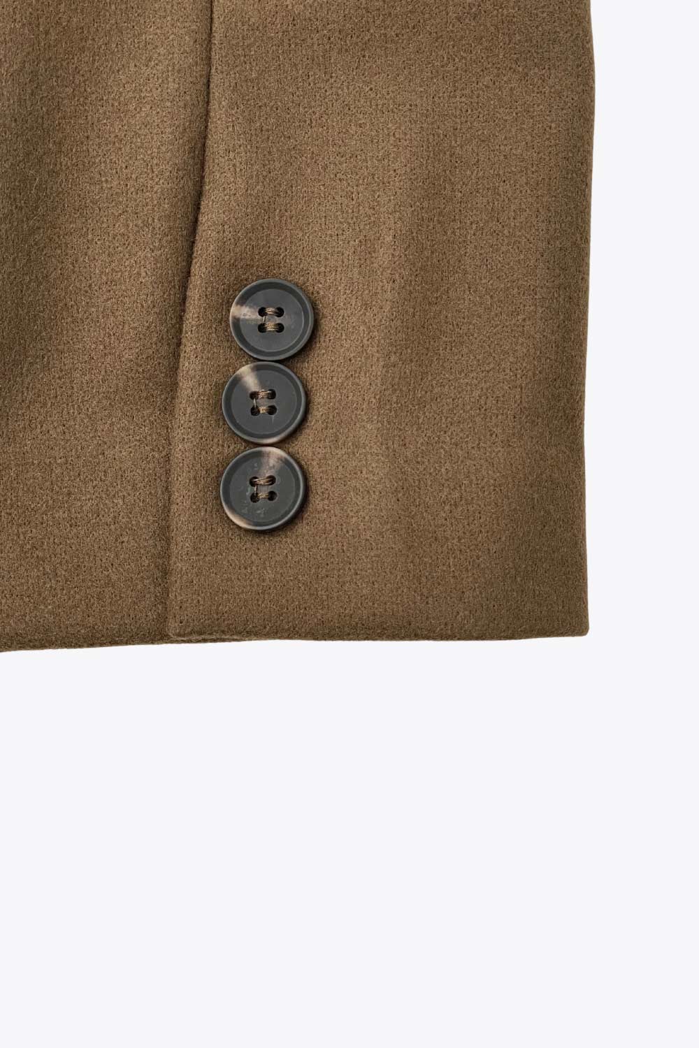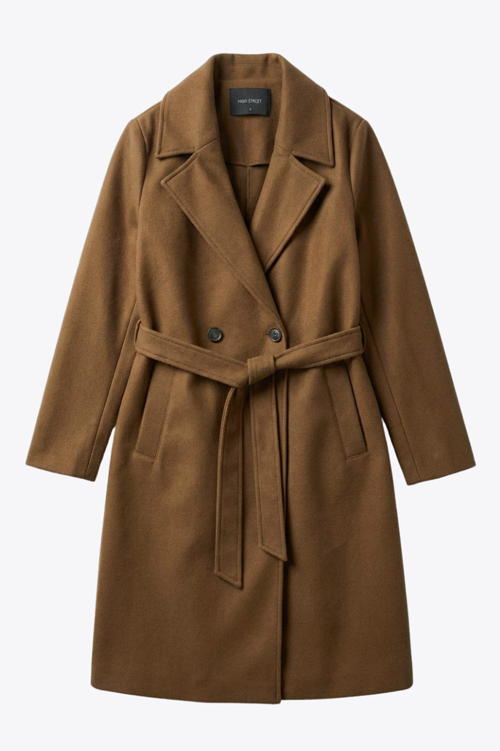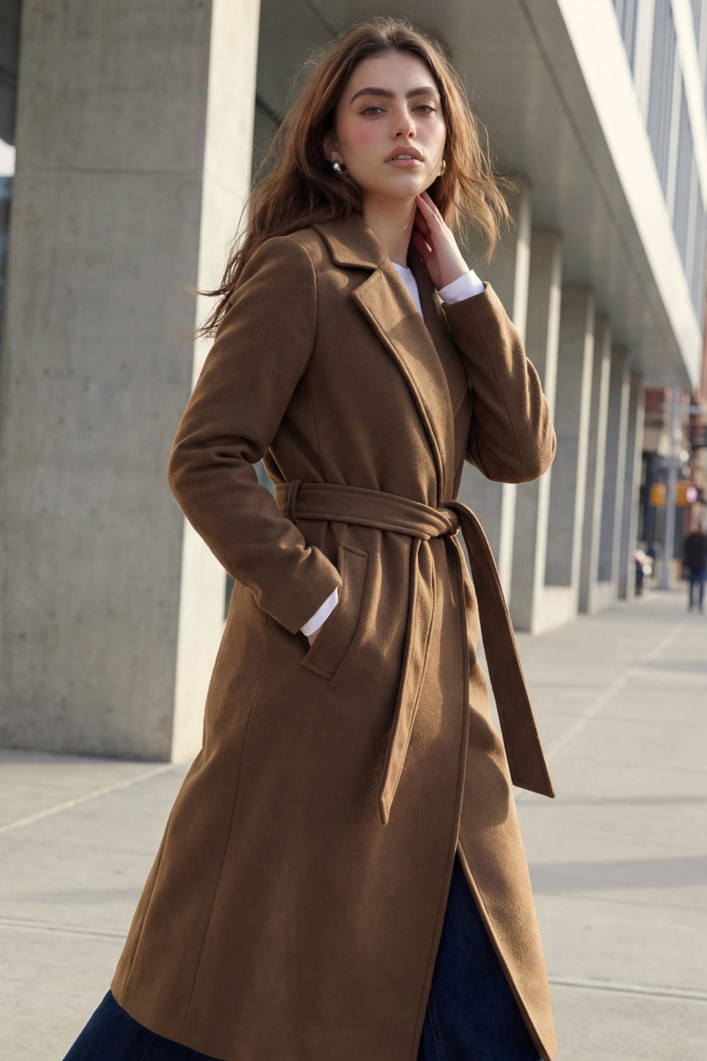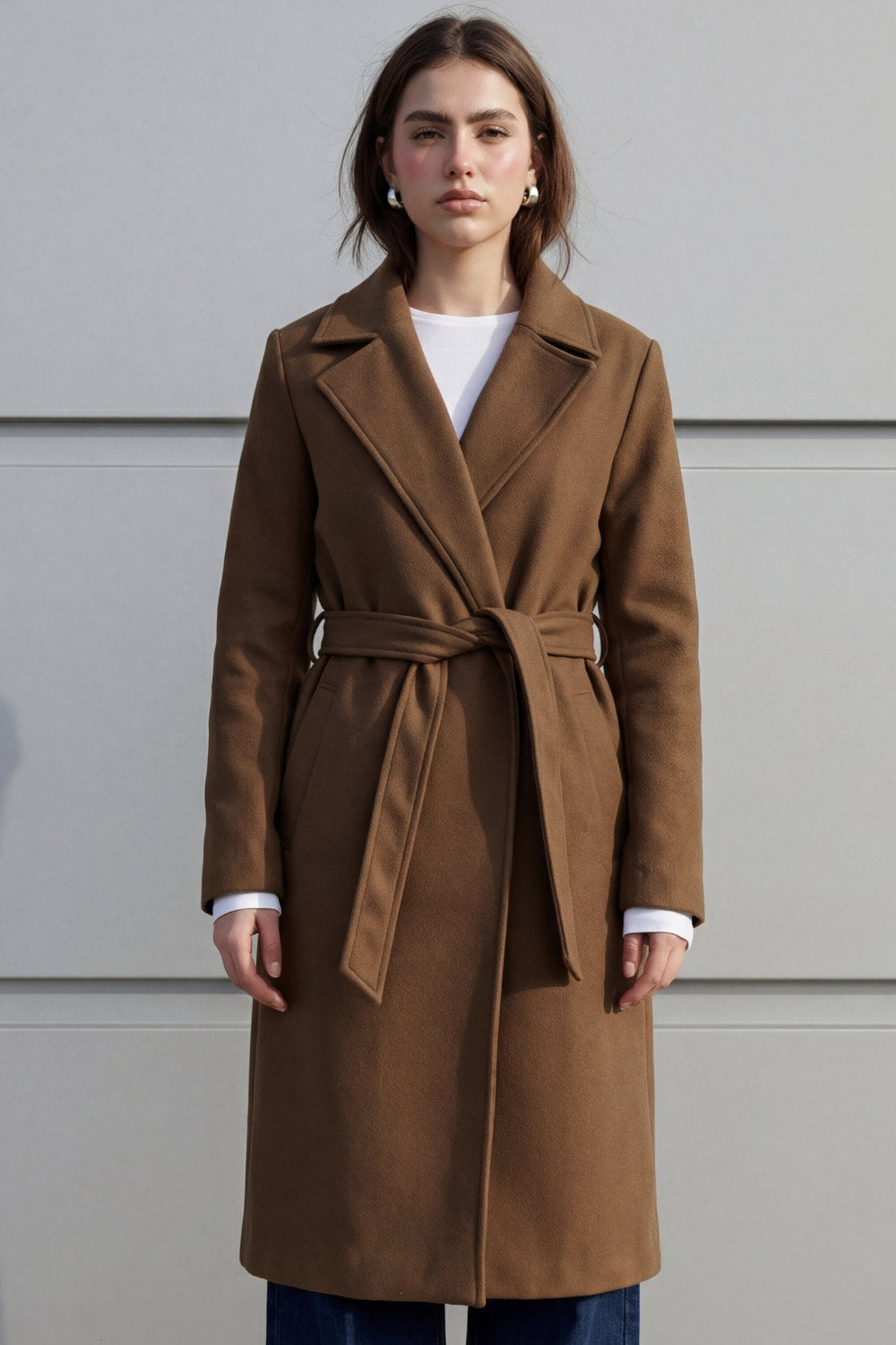 Abrigo largo con cruce de botón en contraste, fit recto, manga larga con puño abotonado, con solapa, trabillas y cinturón amarrable del mismo tejido. Detalle de abertura posterior en bajo.