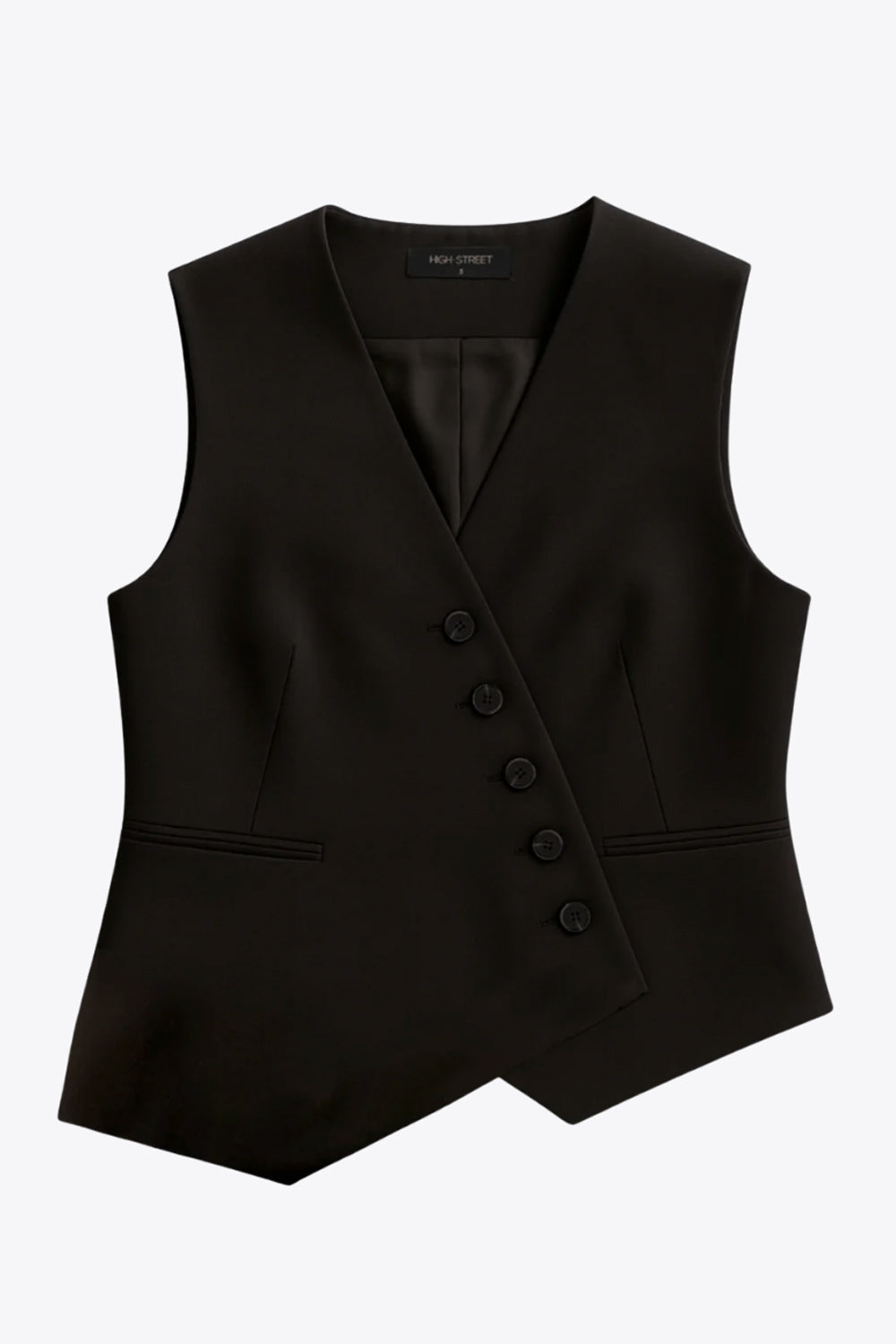 Chaleco asimétrico de fit recto, escote v, vivos decorativos delanteros y cierre frontal con hilera de botones en diagonal. Detalle de bajo asimétrico.